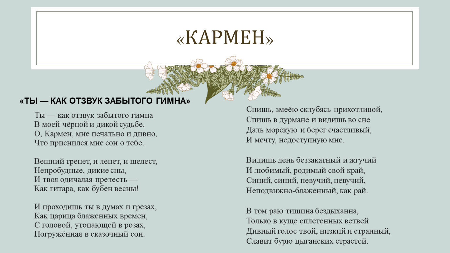 Ты — как отзвук забытого гимнаВ моей чёрной и дикой судьбе.О, Кармен, мне печально и дивно,Что приснился мне сон о тебе.Вешний трепет, и лепет, и шелест,Непробудные, дикие сны,И твоя одичалая прелесть —Как гитара, как бубен весны!И проходишь ты в думах и грезах,Как царица блаженных времен,С головой, утопающей в розах,Погружённая в сказочный сон.