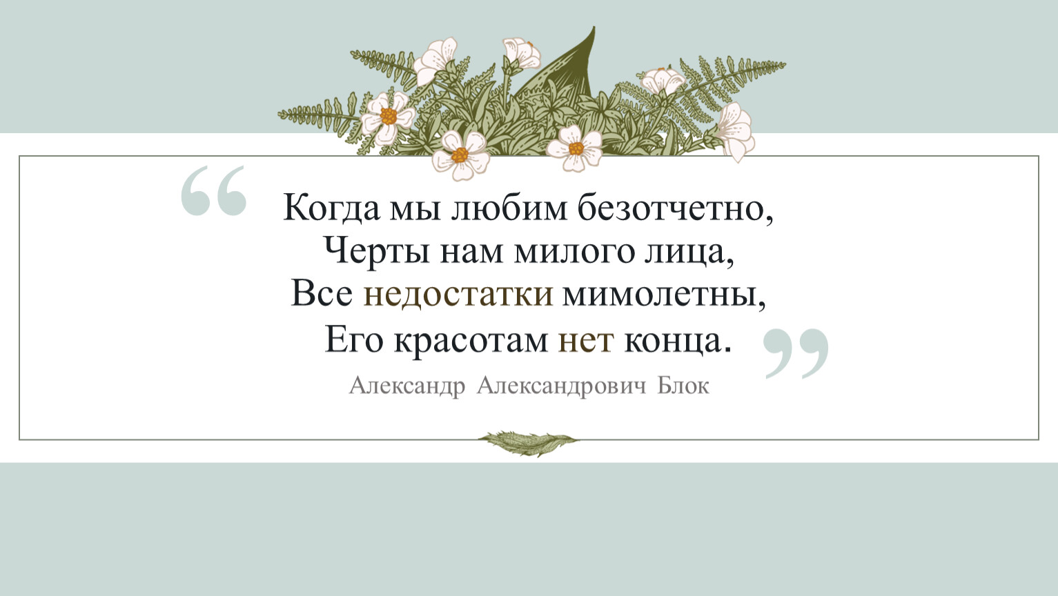 Когда мы любим безотчетно,Черты нам милого лица,Все недостатки мимолетны,Его красотам нет конца.