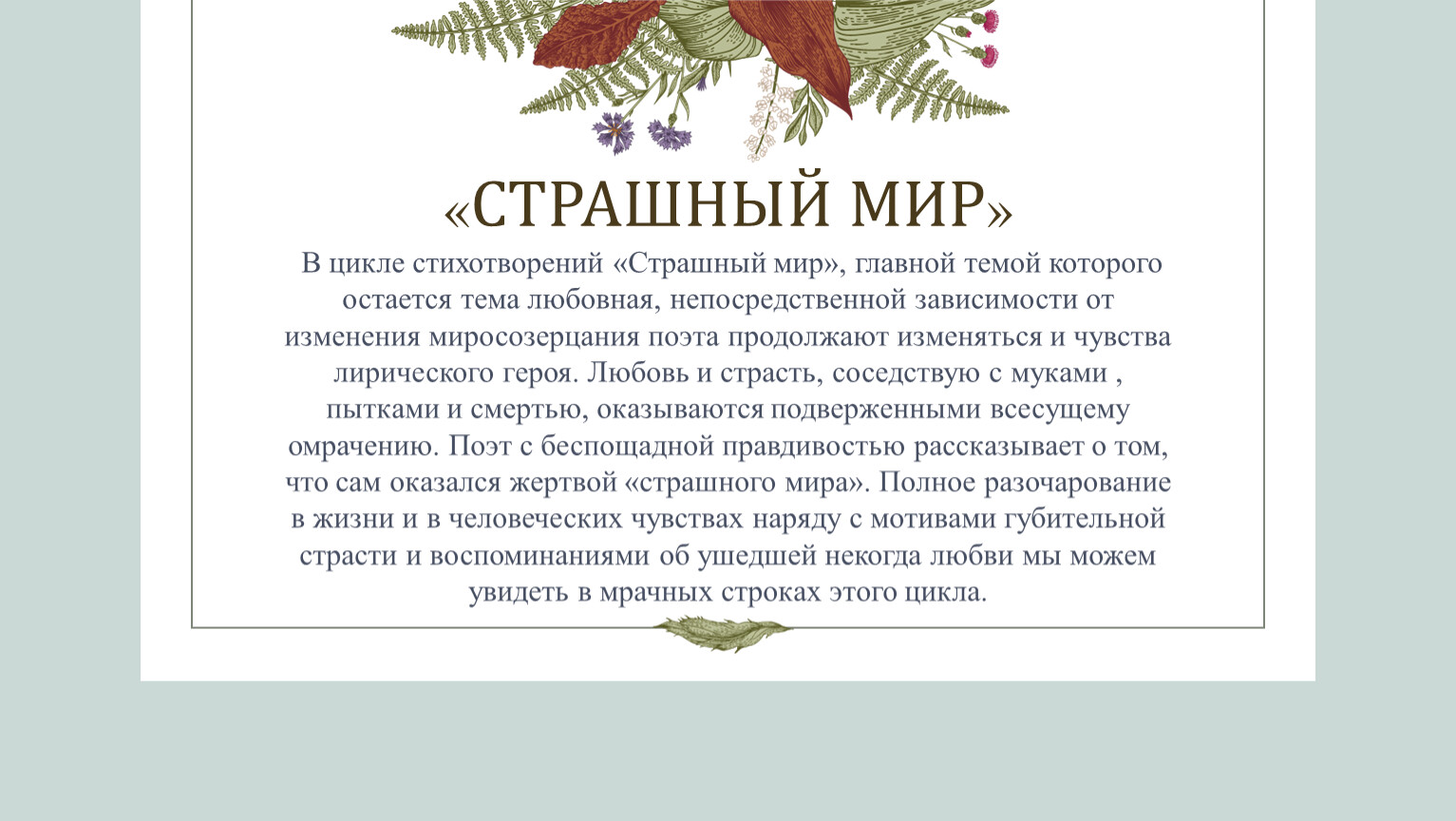 В цикле стихотворений «Страшный мир», главной темой которого остается тема любовная, непосредственной зависимости от изменения миросозерцания поэта продолжают изменяться и чувства лирического героя. Любовь и страсть, соседствую с муками , пытками и смертью, оказываются подверженными всесущему омрачению. Поэт с беспощадной правдивостью рассказывает о том, что сам оказался жертвой «страшного мира». Полное разочарование в жизни и в человеческих чувствах наряду с мотивами губительной страсти и воспоминаниями об ушедшей некогда любви мы можем увидеть в мрачных строках этого цикла.