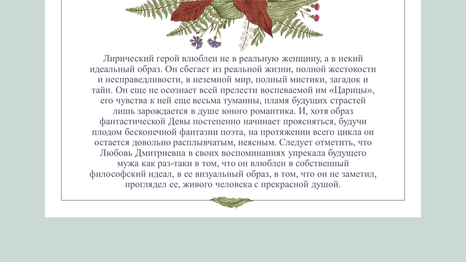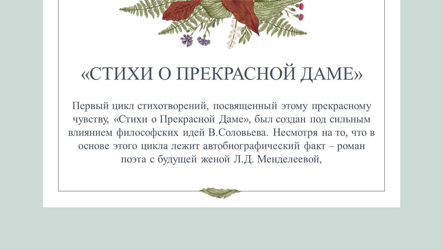 Первый цикл стихотворений, посвященный этому прекрасному чувству, «Стихи о Прекрасной Даме», был создан под сильным влиянием философских идей В.Соловьева. Несмотря на то, что в основе этого цикла лежит автобиографический факт – роман поэта с будущей женой Л.Д. Менделеевой,