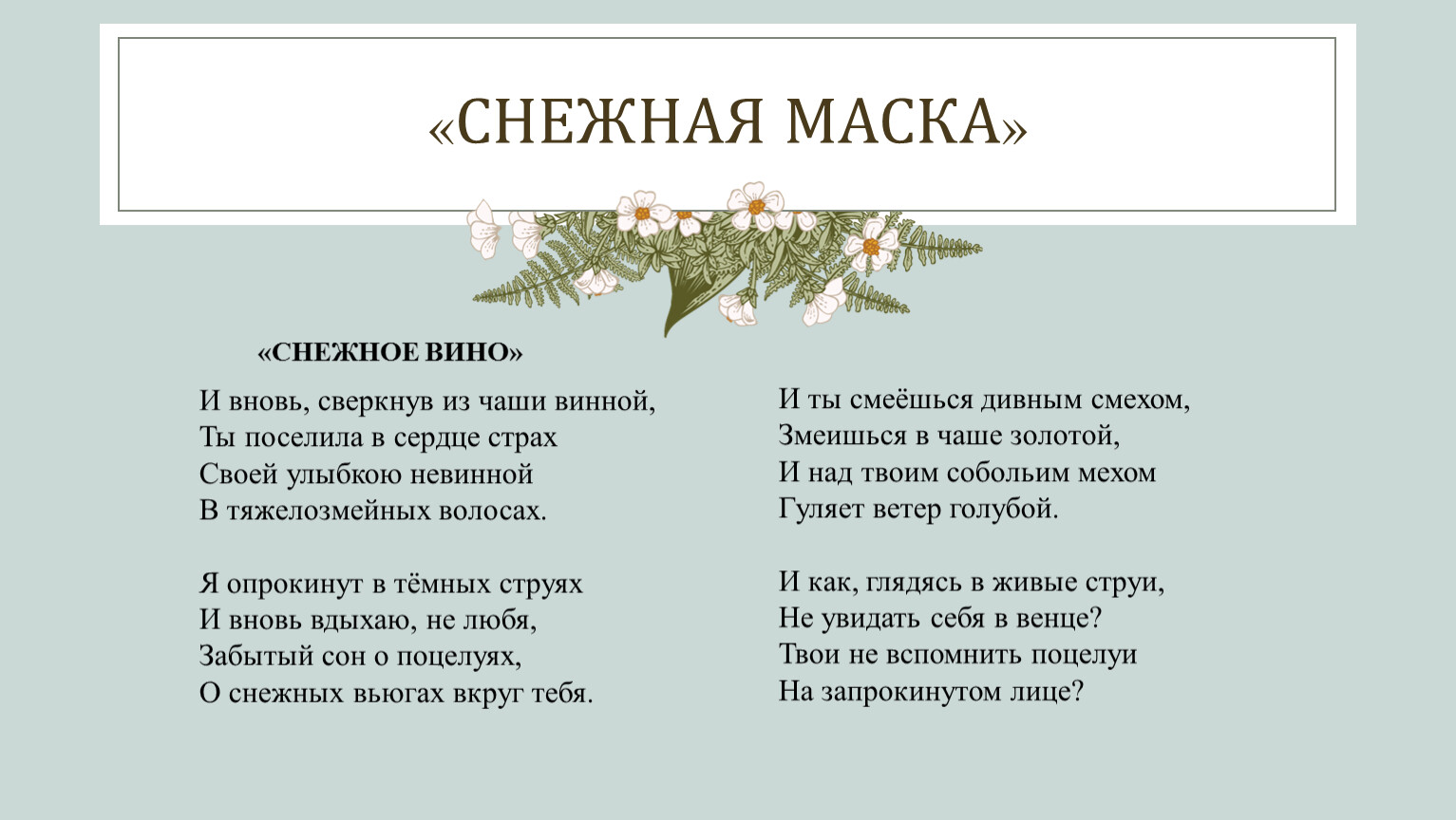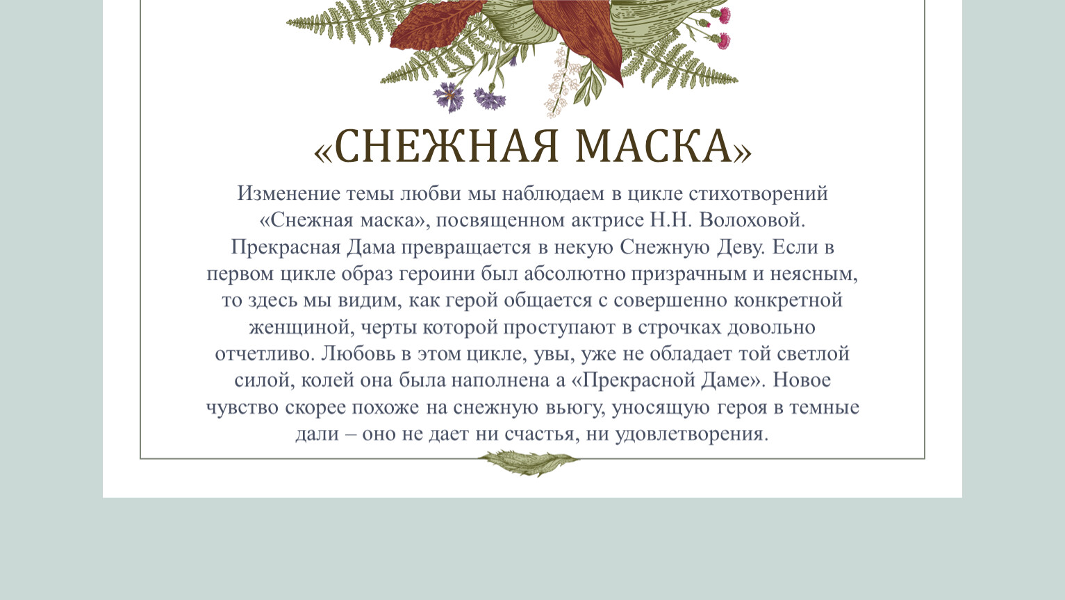 Изменение темы любви мы наблюдаем в цикле стихотворений «Снежная маска», посвященном актрисе Н.Н. Волоховой. Прекрасная Дама превращается в некую Снежную Деву. Если в первом цикле образ героини был абсолютно призрачным и неясным, то здесь мы видим, как герой общается с совершенно конкретной женщиной, черты которой проступают в строчках довольно отчетливо. Любовь в этом цикле, увы, уже не обладает той светлой силой, колей она была наполнена а «Прекрасной Даме». Новое чувство скорее похоже на снежную вьюгу, уносящую героя в темные дали – оно не дает ни счастья, ни удовлетворения.