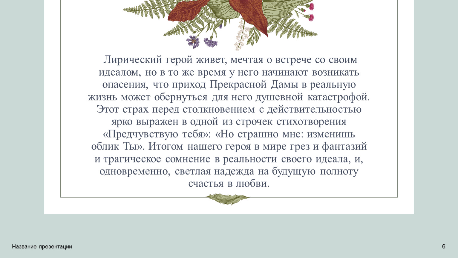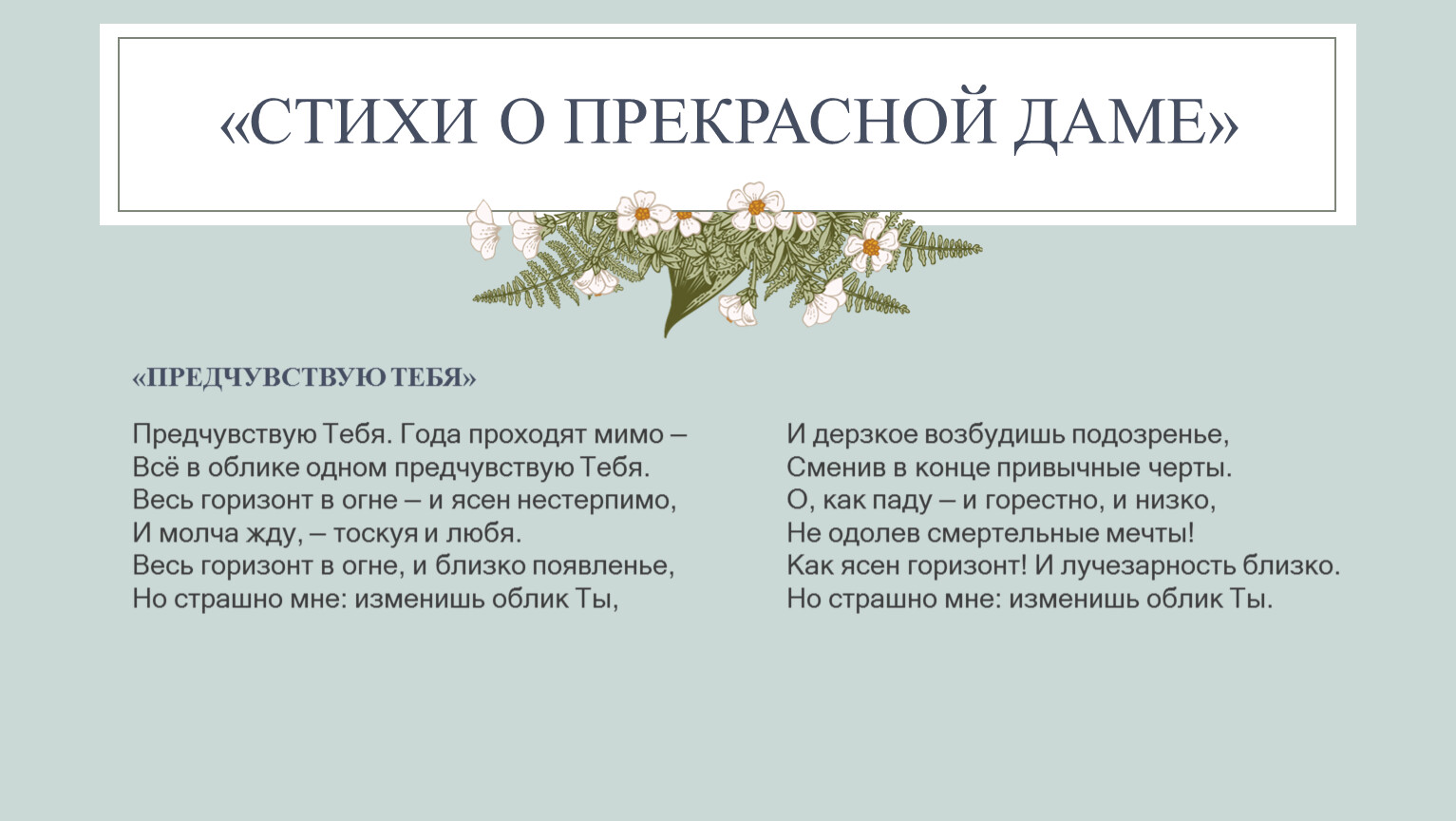 Лирический герой живет, мечтая о встрече со своим идеалом, но в то же время у него начинают возникать опасения, что приход Прекрасной Дамы в реальную жизнь может обернуться для него душевной катастрофой. Этот страх перед столкновением с действительностью ярко выражен в одной из строчек стихотворения «Предчувствую тебя»: «Но страшно мне: изменишь облик Ты». Итогом нашего героя в мире грез и фантазий и трагическое сомнение в реальности своего идеала, и, одновременно, светлая надежда на будущую полноту счастья в любви.