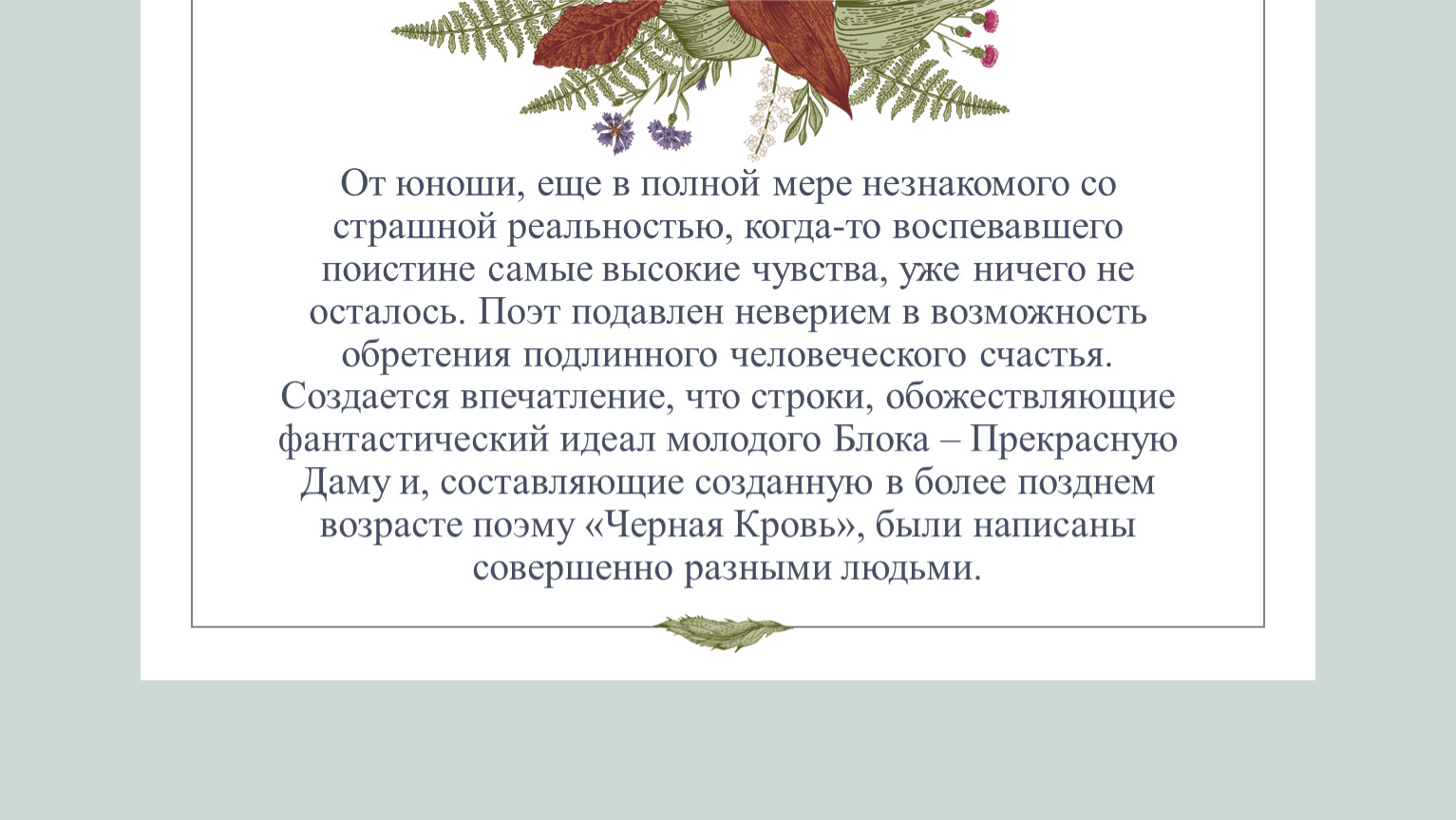 От юноши, еще в полной мере незнакомого со страшной реальностью, когда-то воспевавшего поистине самые высокие чувства, уже ничего не осталось. Поэт подавлен неверием в возможность обретения подлинного человеческого счастья. Создается впечатление, что строки, обожествляющие фантастический идеал молодого Блока – Прекрасную Даму и, составляющие созданную в более позднем возрасте поэму «Черная Кровь», были написаны совершенно разными людьми.
