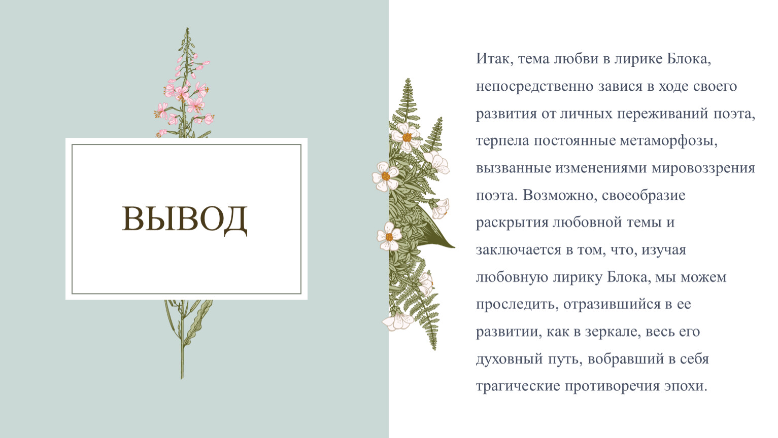 Итак, тема любви в лирике Блока, непосредственно завися в ходе своего развития от личных переживаний поэта, терпела постоянные метаморфозы, вызванные изменениями мировоззрения поэта. Возможно, своеобразие раскрытия любовной темы и заключается в том, что, изучая любовную лирику Блока, мы можем проследить, отразившийся в ее развитии, как в зеркале, весь его духовный путь, вобравший в себя трагические противоречия эпохи.