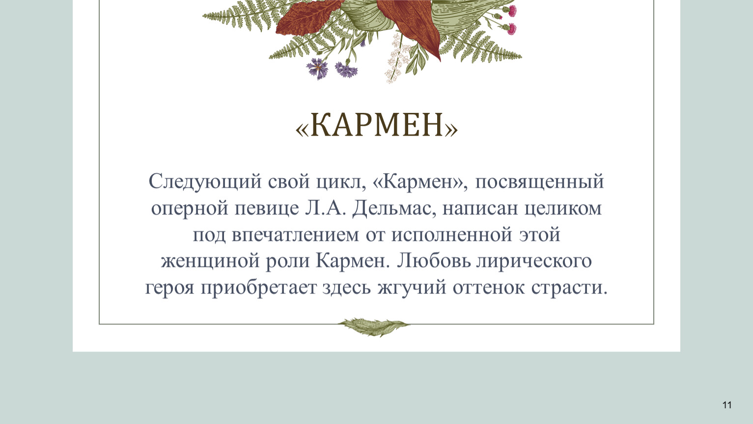 Следующий свой цикл, «Кармен», посвященный оперной певице Л.А. Дельмас, написан целиком под впечатлением от исполненной этой женщиной роли Кармен. Любовь лирического героя приобретает здесь жгучий оттенок страсти.
