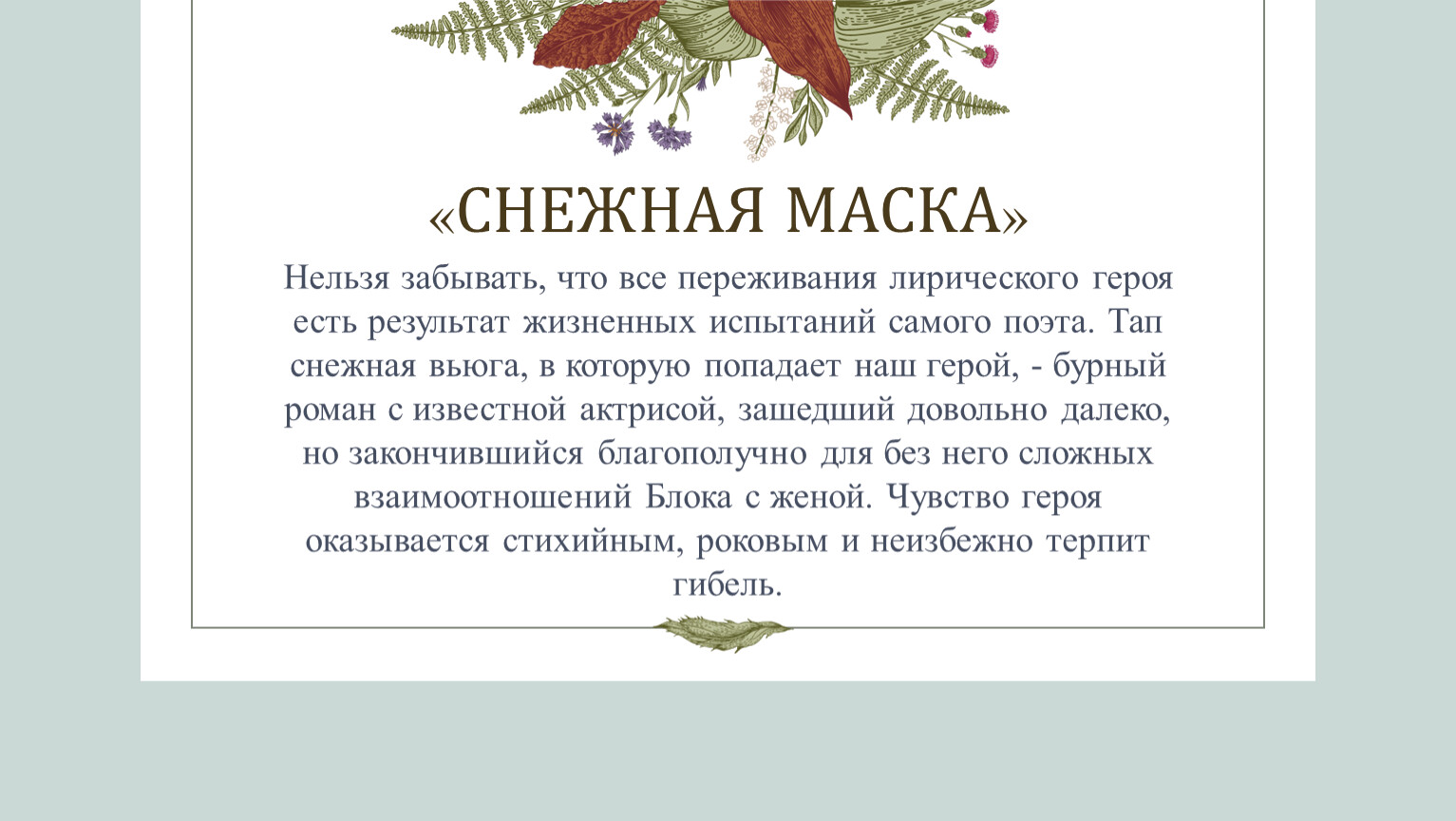 Нельзя забывать, что все переживания лирического героя есть результат жизненных испытаний самого поэта. Тап снежная вьюга, в которую попадает наш герой, - бурный роман с известной актрисой, зашедший довольно далеко, но закончившийся благополучно для без него сложных взаимоотношений Блока с женой. Чувство героя оказывается стихийным, роковым и неизбежно терпит гибель.