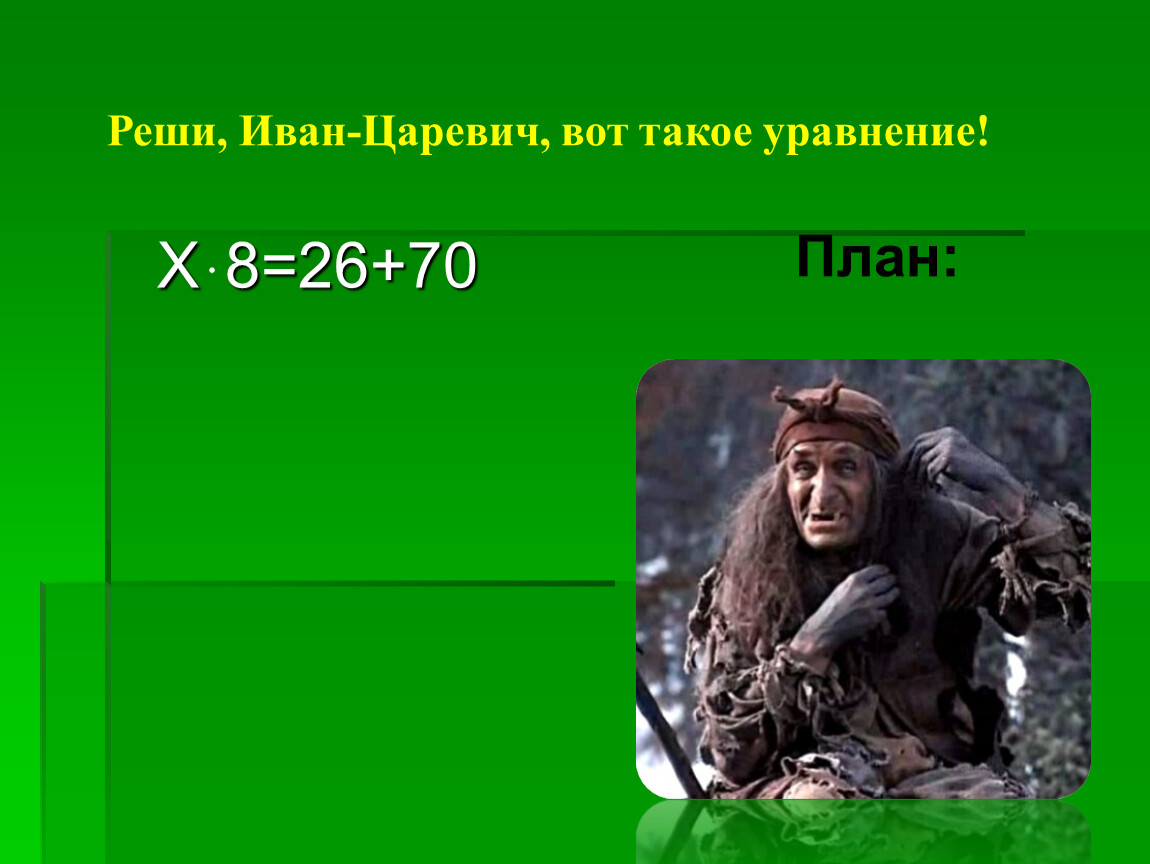 «- Молодец, Иван-Царевич, -говорит Баба Яга. Открою тебе два секрета Кощея. Игла, в которой заключена смерть его, хранится в шкатулке под троном. И открыть её можно, решив уравнения, написанные на ней.»