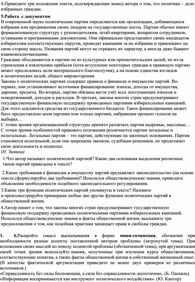 5.Работа с документом В современной науке политические партии определяются как организации, добивающиеся избрания или продвижения своих лидеров на государственные посты. Партии обычно имеют формализованную структуру с руководителями, штаб-квартирами, аппаратом сотрудников, уставными и программными документами. Они официально представляют своих кандидатов избирателям соответствующих округов, проводят кампании за их избрание и привлекают на свою сторону массы. Названия партий могут не отражать их характер, а иногда даже бывают взаимоисключающими. Граждане