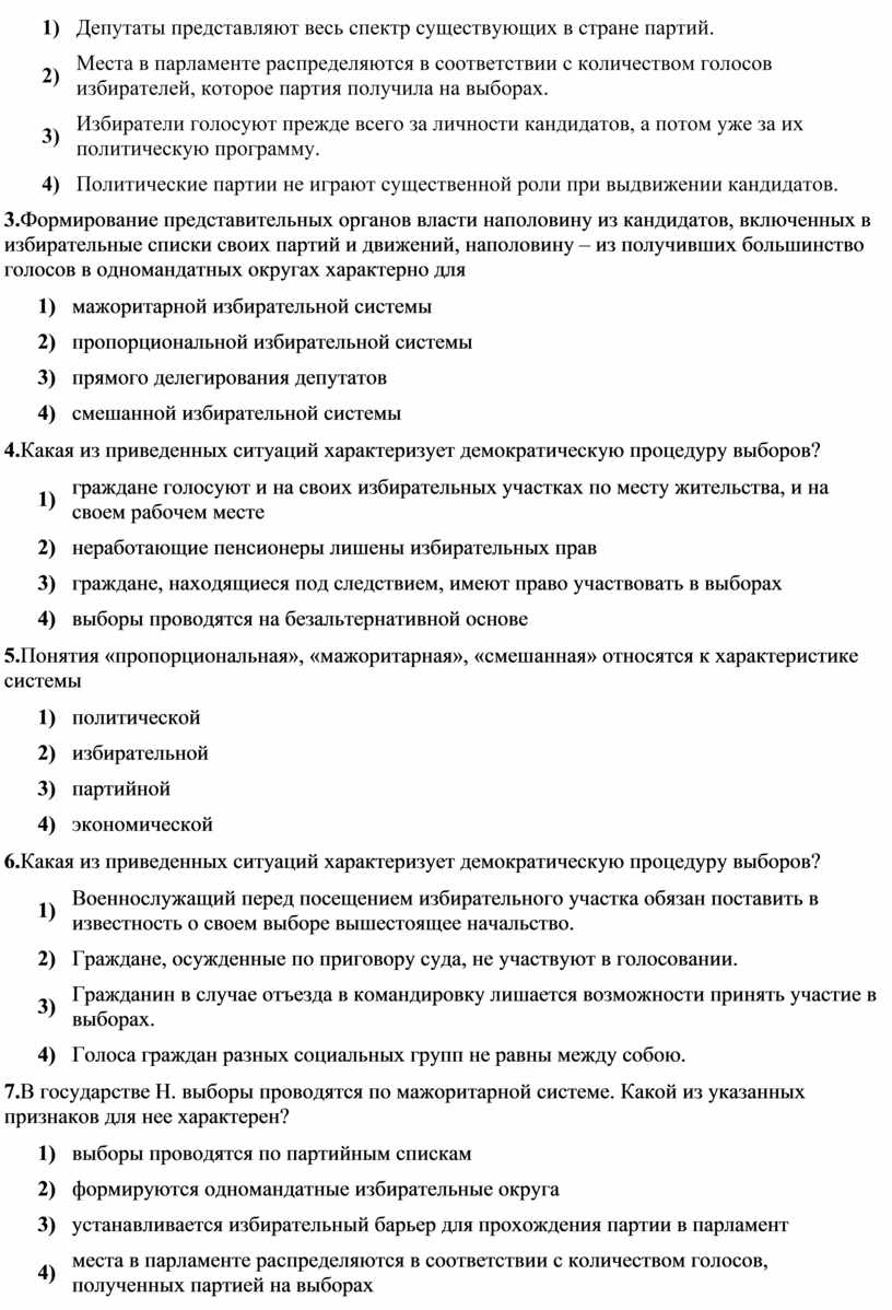 2.В государстве Z существует многопартийная система и регулярно проводятся выборы в парламент. Какая дополнительная информация позволит определить тип избирательной системы (мажоритарная или пропорциональная), действующей в государстве Z? Сформулируйте три вопроса для получения необходимой дополнительной информации.