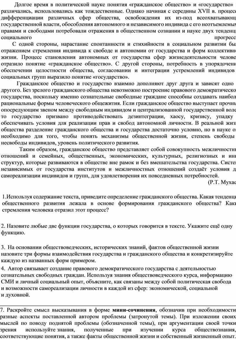 сознании и науке двух тенденций социального прогресса. Гражданское общество и государство взаимно дополняют друг друга и зависят одно от другого. Без зрелого гражданского общества невозможно построение правового демократического государства, поскольку именно сознательные свободные граждане способны создавать наиболее рациональные формы человеческого общежития. Если гражданское общество выступает прочным опосредующим звеном между свободным индивидом и централизованной государственной волей, то государство призвано противодействовать дезинтеграции, хаосу, кризису, упадку и обеспечивать условия для реализации прав и свобод автономной личности. В реальной жизни общества разделение гражданского общества и государства достаточно условно, но в науке оно необходимо для того, чтобы понять механизмы общественной жизни, степень свободы и несвободы индивидов, уровень политического развития. Таким образом, гражданское общество представляет собой совокупность межличностных отношений и семейных, общественных, экономических, культурных, религиозных и иных структур, которые развиваются в обществе вне рамок и без вмешательства государства. Система независимых от государства институтов и межличностных отношений создаёт условия для самореализации индивидов и групп, для удовлетворения их повседневных потребностей. (Р.Т. Мухаев)