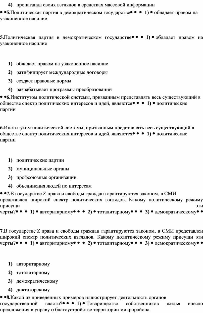 7.В государстве Z права и свободы граждан гарантируются законом, в СМИ представлен широкий спектр политических взглядов. Какому политическому режиму присущи эти черты? |