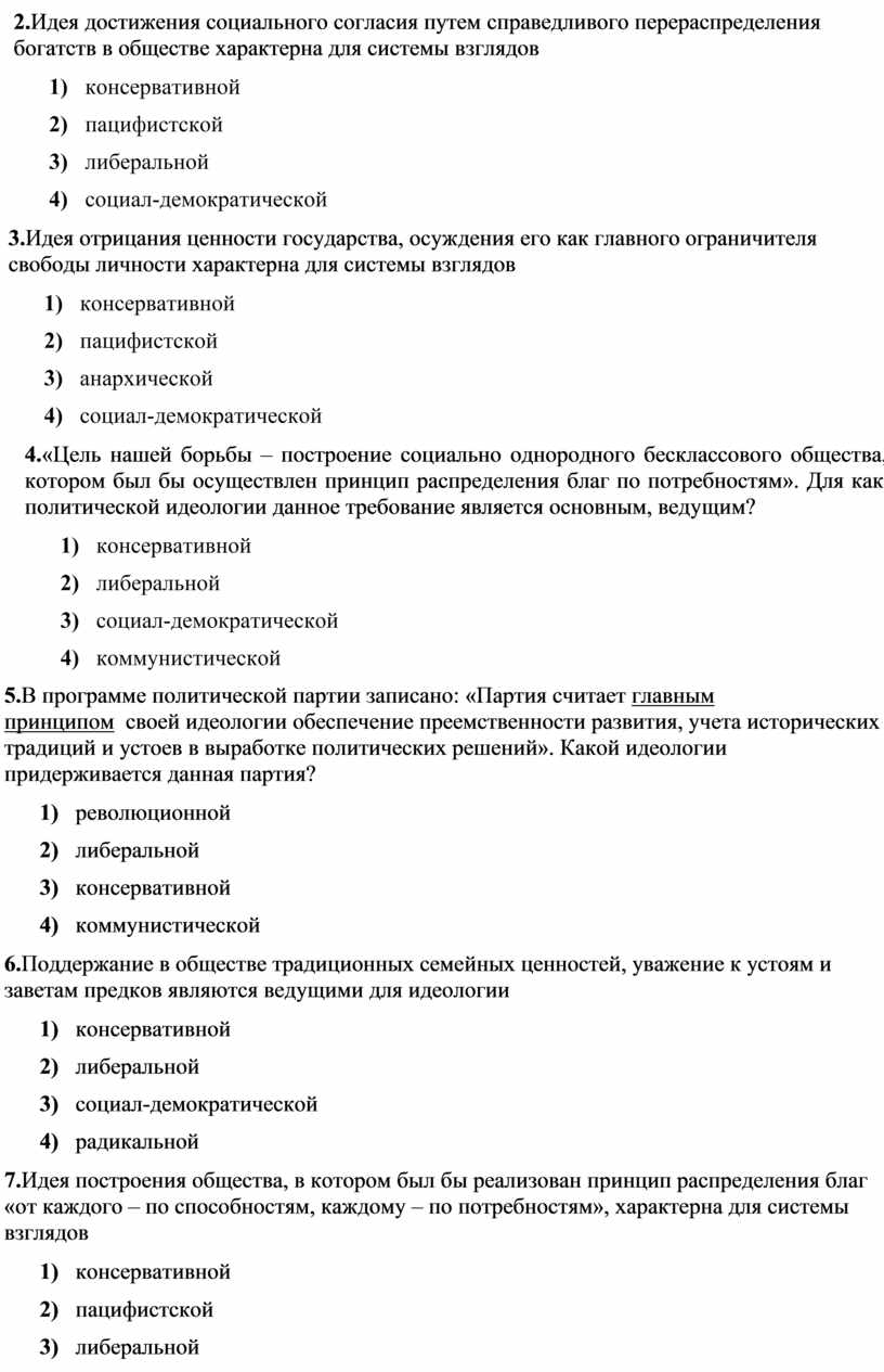 5.В программе политической партии записано: «Партия считает главным принципом своей идеологии обеспечение преемственности развития, учета исторических традиций и устоев в выработке политических решений». Какой идеологии придерживается данная партия? |