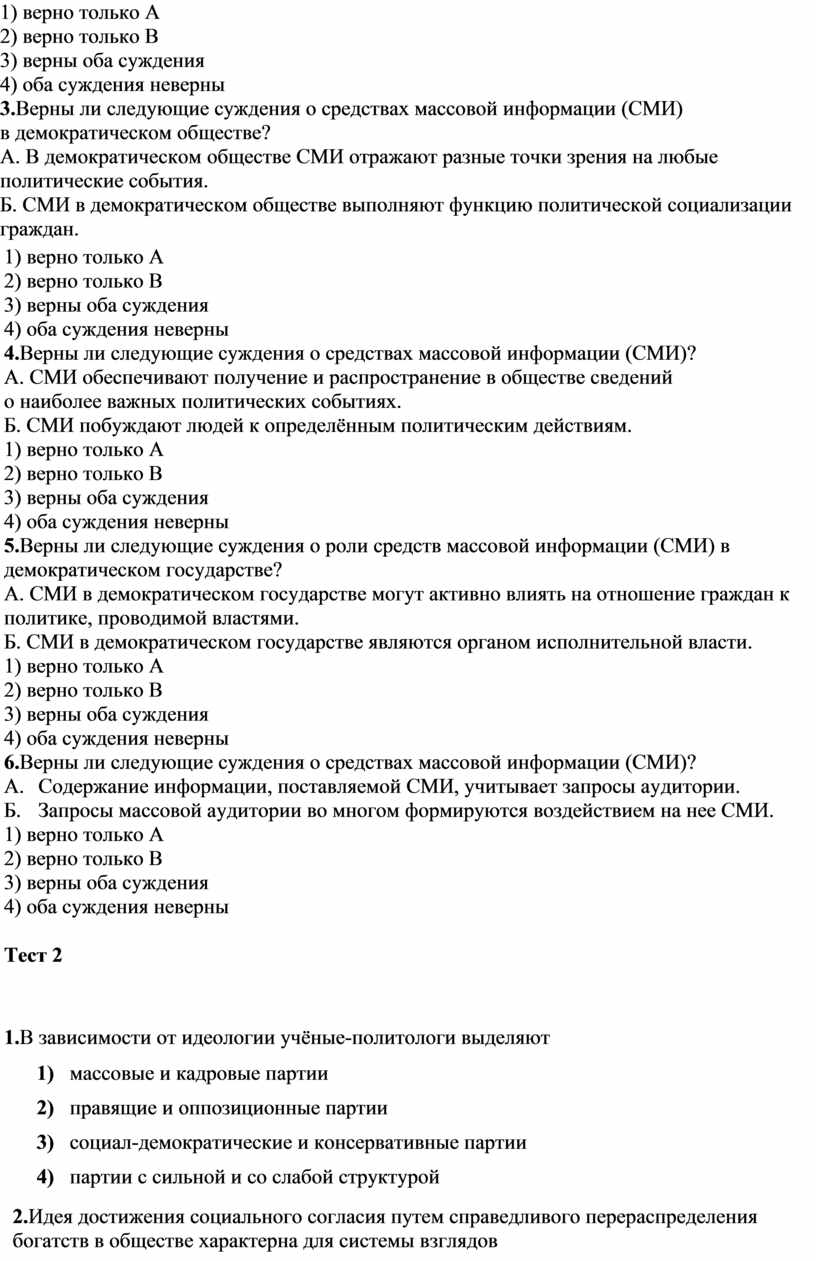 сведений Б. СМИ побуждают людей к определённым политическим действиям. 1) верно только А 2) верно только В 3) верны оба суждения 4) оба суждения неверны 5.Верны ли следующие суждения о роли средств массовой информации (СМИ) в демократическом государстве? А. СМИ в демократическом государстве могут активно влиять на отношение граждан к политике, проводимой властями. Б. СМИ в демократическом государстве являются органом исполнительной власти. 1) верно только А 2) верно только В 3) верны оба суждения 4) оба суждения неверны 6.Верны ли следующие суждения о средствах массовой информации (СМИ)?