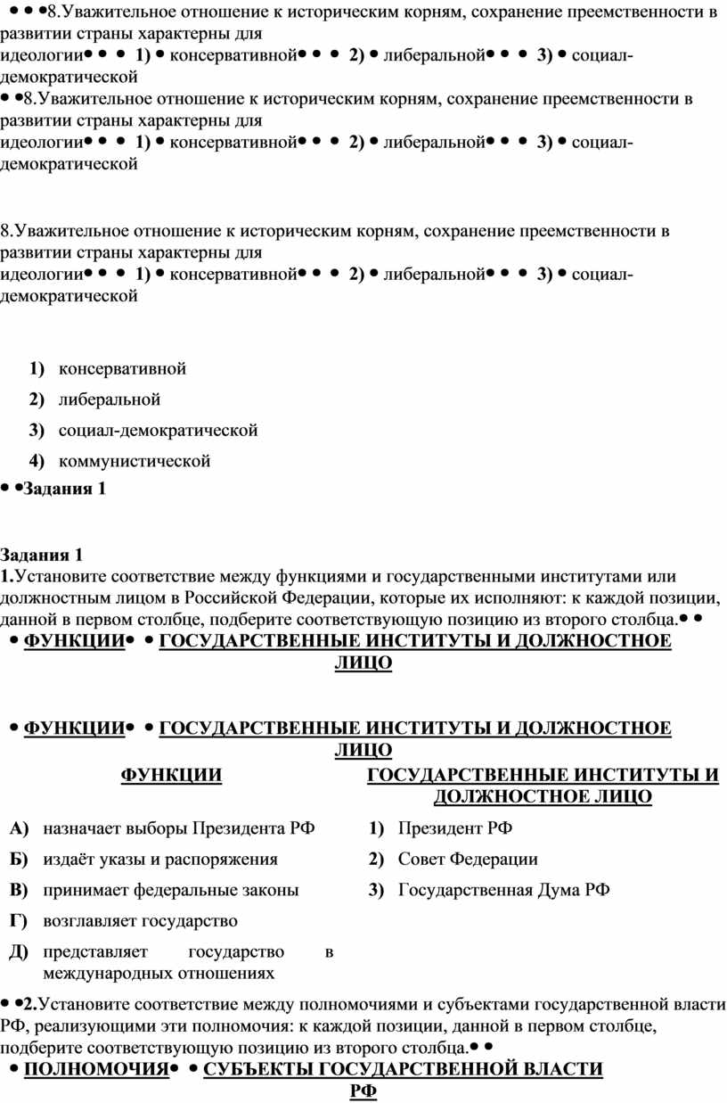 1.Установите соответствие между функциями и государственными институтами или должностным лицом в Российской Федерации, которые их исполняют: к каждой позиции, данной в первом столбце, подберите соответствующую позицию из второго столбца. |