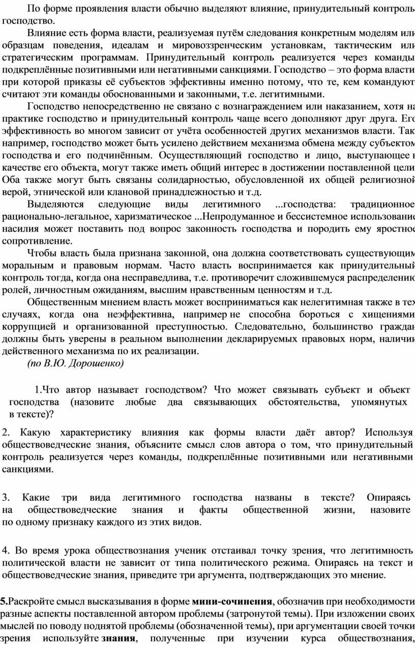 По форме проявления власти обычно выделяют влияние, принудительный контроль, господство. Влияние есть форма власти, реализуемая путём следования конкретным моделям или образцам поведения, идеалам и мировоззренческим установкам, тактическим или стратегическим программам. Принудительный контроль реализуется через команды, подкреплённые позитивными или негативными санкциями. Господство – это форма власти, при которой приказы её субъектов эффективны именно потому, что те, кем командуют, считают эти команды обоснованными и законными, т.е. легитимными. Господство непосредственно не связано с вознаграждением или наказанием, хотя на практике господство и принудительный контроль чаще всего дополняют друг друга. Его эффективность во многом зависит от учёта особенностей других механизмов власти. Так, например, господство может быть усилено действием механизма обмена между субъектом господства и его подчинённым. Осуществляющий господство и лицо, выступающее в качестве его объекта, могут также иметь общий интерес в достижении поставленной цели. Оба также могут быть связаны солидарностью, обусловленной их общей религиозной верой, этнической или клановой принадлежностью и т.д. Выделяются следующие виды легитимного ...господства: традиционное, рационально-легальное, харизматическое ...Непродуманное и бессистемное использование насилия может поставить под вопрос законность господства и породить ему яростное сопротивление. Чтобы власть была признана законной, она должна соответствовать существующим моральным и правовым нормам. Часто власть воспринимается как принудительный контроль тогда, когда она несправедлива, т.е. противоречит сложившемуся распределению ролей, личностным ожиданиям, высшим нравственным ценностям и т.д. Общественным мнением власть может восприниматься как нелегитимная также в тех случаях, когда она неэффективна, например не способна бороться с хищениями, коррупцией и организованной преступностью. Следовательно, большинство граждан должны быть уверены в реальном выполнении декларируемых правовых норм, наличии действенного механизма по их реализации. (по В.Ю. Дорошенко)