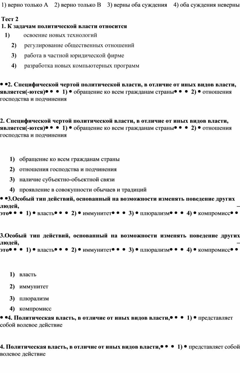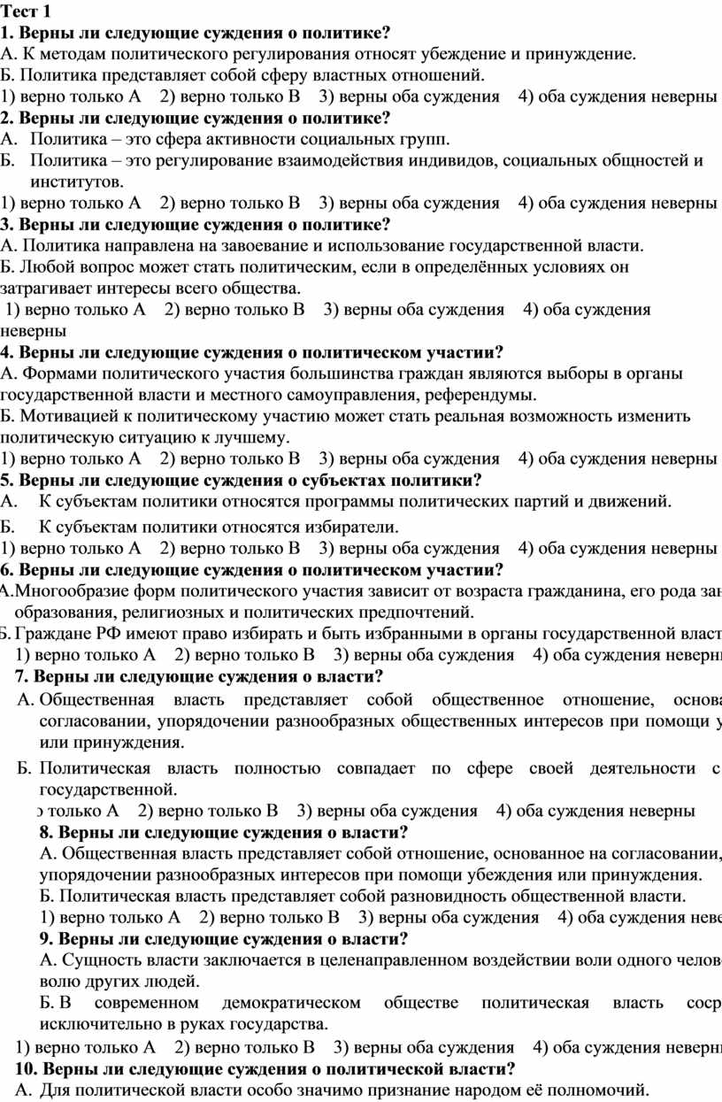 1) верно только А 2) верно только В 3) верны оба суждения 4) оба суждения неверны 10. Верны ли следующие суждения о политической власти?