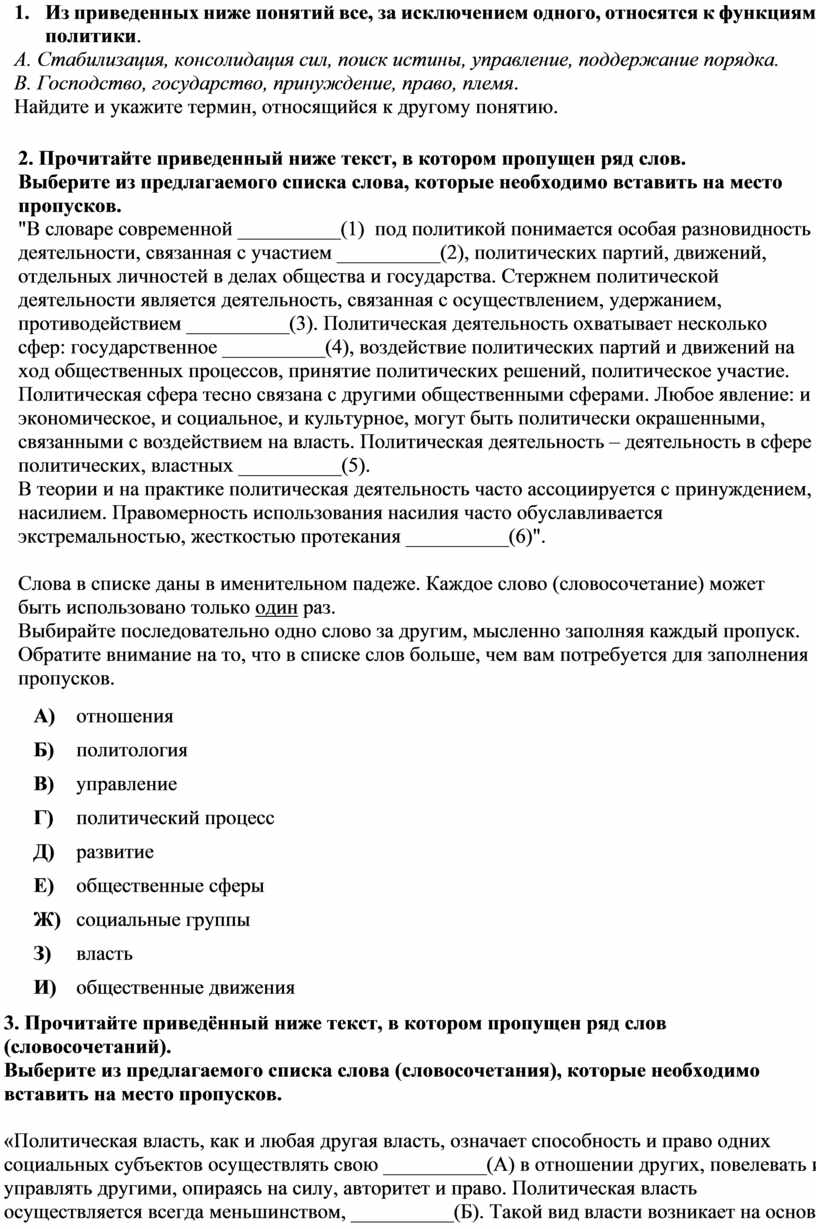 2. Прочитайте приведенный ниже текст, в котором пропущен ряд слов. Выберите из предлагаемого списка слова, которые необходимо вставить на место пропусков. "В словаре современной __________(1) под политикой понимается особая разновидность деятельности, связанная с участием __________(2), политических партий, движений, отдельных личностей в делах общества и государства. Стержнем политической деятельности является деятельность, связанная с осуществлением, удержанием, противодействием __________(3). Политическая деятельность охватывает несколько сфер: государственное __________(4), воздействие политических партий и движений на ход общественных процессов, принятие политических решений, политическое участие. Политическая сфера тесно связана с другими общественными сферами. Любое явление: и экономическое, и социальное, и культурное, могут быть политически окрашенными, связанными с воздействием на власть. Политическая деятельность – деятельность в сфере политических, властных __________(5). В теории и на практике политическая деятельность часто ассоциируется с принуждением, насилием. Правомерность использования насилия часто обуславливается экстремальностью, жесткостью протекания __________(6)".