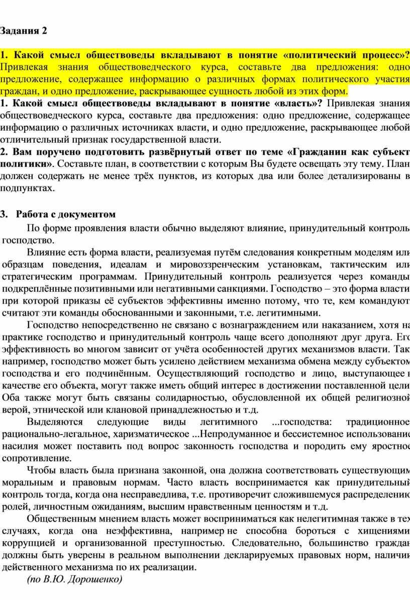 1. Какой смысл обществоведы вкладывают в понятие «политический процесс»? Привлекая знания обществоведческого курса, составьте два предложения: одно предложение, содержащее информацию о различных формах политического участия граждан, и одно предложение, раскрывающее сущность любой из этих форм.