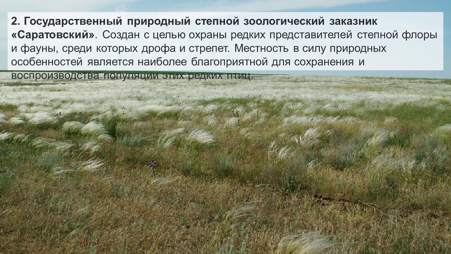 2. Государственный природный степной зоологический заказник «Саратовский». Создан с целью охраны редких представителей степной флоры и фауны, среди которых дрофа и стрепет. Местность в силу природных особенностей является наиболее благоприятной для сохранения и воспроизводства популяции этих редких птиц.