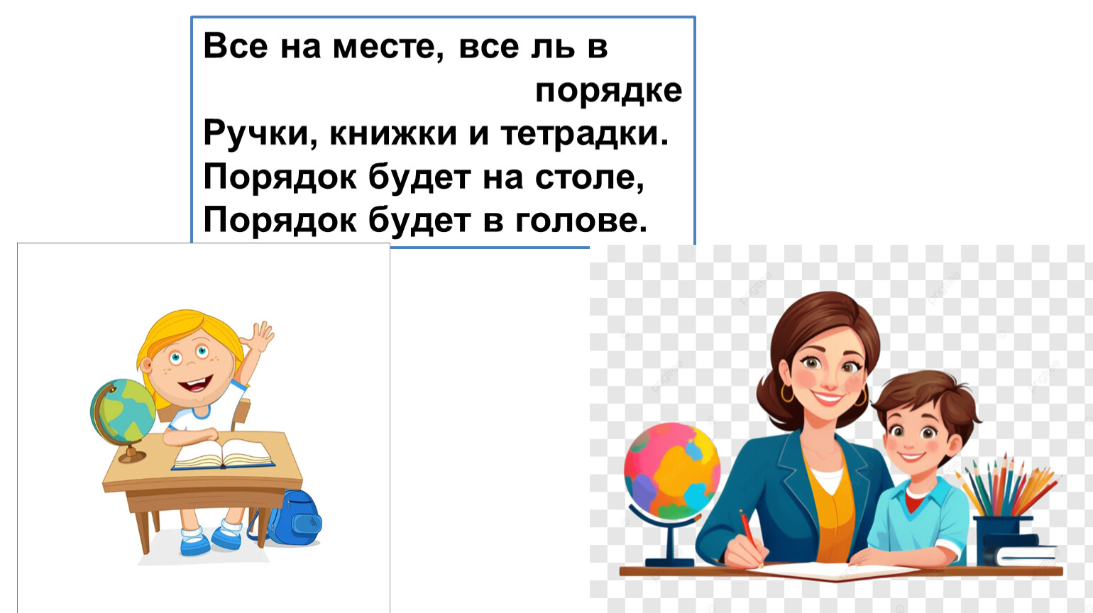 порядкеРучки, книжки и тетрадки.Порядок будет на столе,Порядок будет в голове.