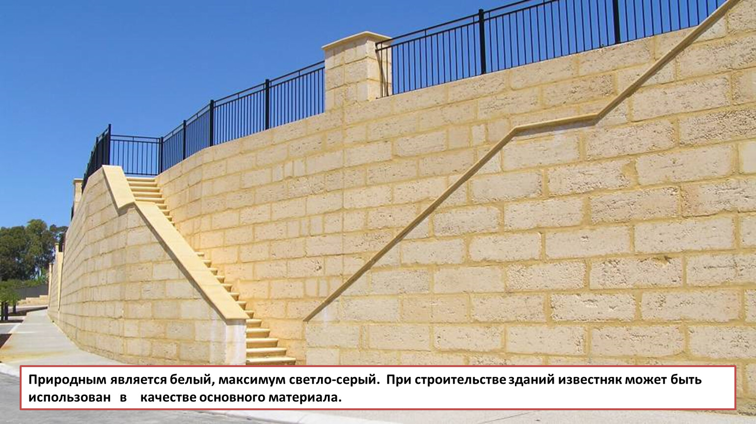 Природным является белый, максимум светло-серый. При строительстве зданий известняк может быть использован в качестве основного материала.