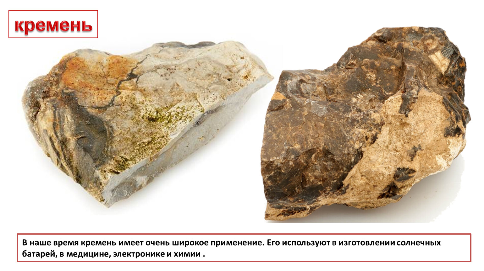 В наше время кремень имеет очень широкое применение. Его используют в изготовлении солнечных батарей, в медицине, электронике и химии .