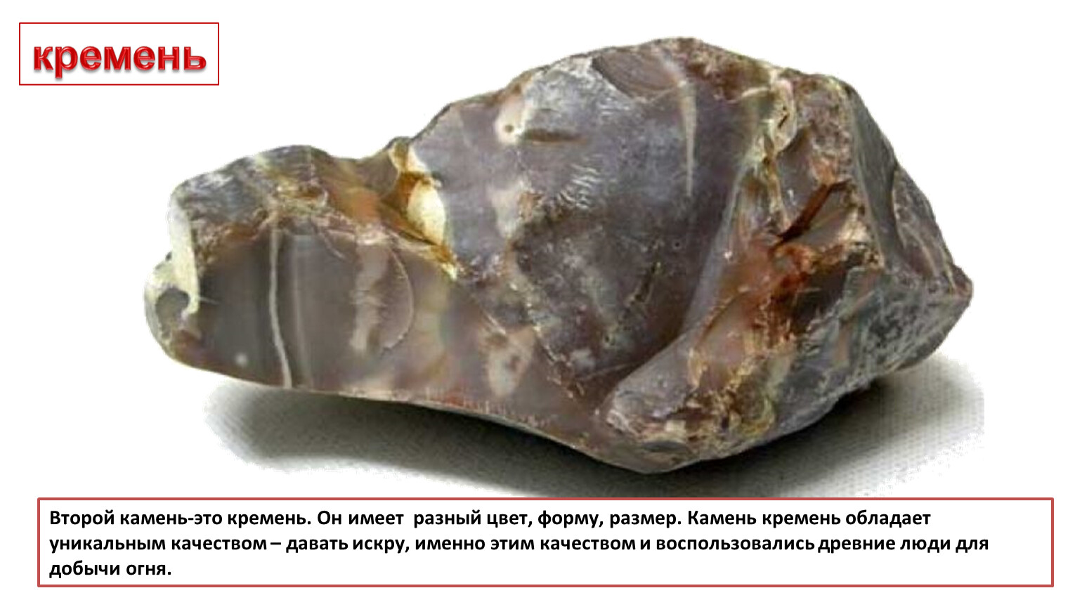 Второй камень-это кремень. Он имеет разный цвет, форму, размер. Камень кремень обладает уникальным качеством – давать искру, именно этим качеством и воспользовались древние люди для добычи огня.