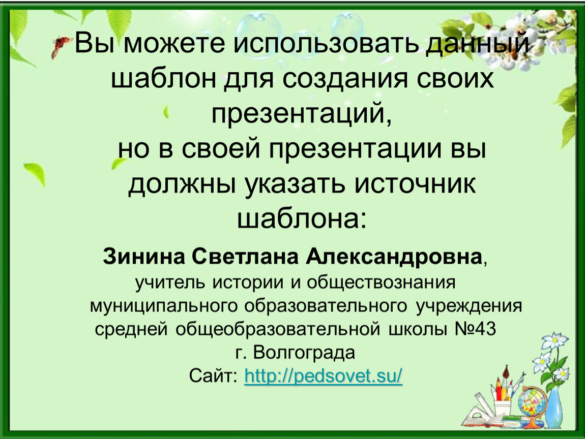 Вы можете использовать данный шаблон для создания своих презентаций, но в своей презентации вы должны указать источник шаблона: