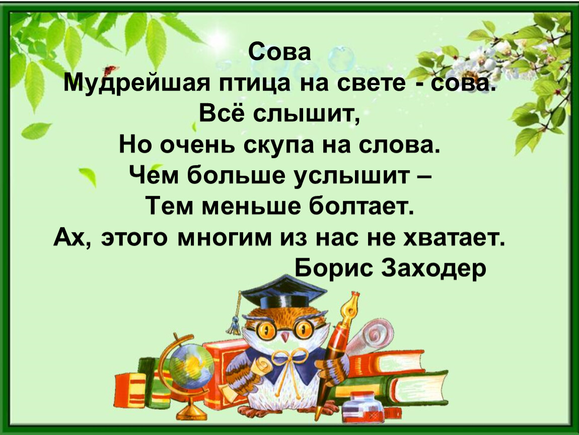 СоваМудрейшая птица на свете - сова. Всё слышит, Но очень скупа на слова. Чем больше услышит – Тем меньше болтает. Ах, этого многим из нас не хватает. Борис Заходер