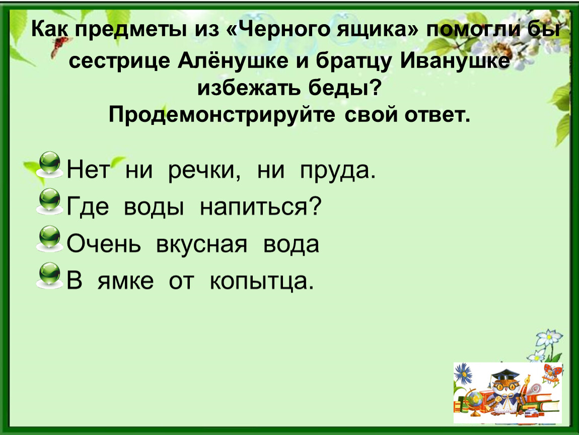 Как предметы из «Черного ящика» помогли бы сестрице Алёнушке и братцу Иванушке избежать беды? Продемонстрируйте свой ответ.