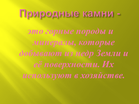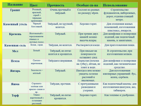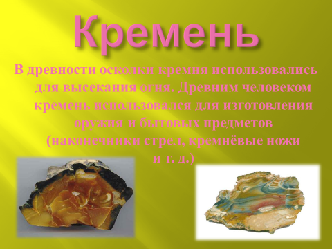 Кремень | Желтоватый с чередованием тёмных и светлых полос. | Твёрдый. | При трении двух камней можно высечь искры. | Для шлифовки и полировки изделий, как поделочный камень, в зажигалках. |