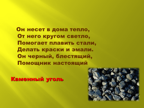 Он несет в дома тепло, От него кругом светло, Помогает плавить стали, Делать краски и эмали. Он черный, блестящий, Помощник настоящий