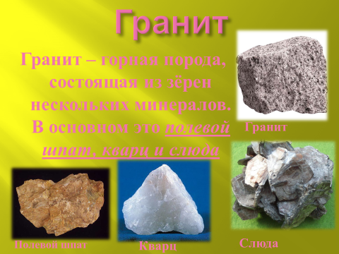 Гранит – горная порода, состоящая из зёрен нескольких минералов. В основном это полевой шпат, кварц и слюда