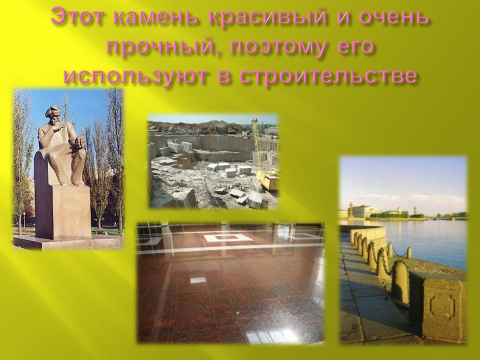 Гранит | Розовый, красный, серый с чёрными крапинами. | Очень прочный и твёрдый. | Состоит из разных по размеру зёрен. | Строительство фундаментов, набережных, дорог, отделка станций метро. |