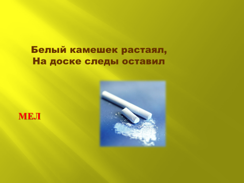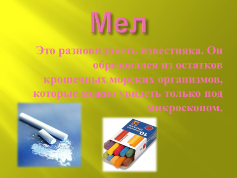 Мел | Белый. | Твёрдый, но легко колется и крошится. | При письме на поверхности оставляет след | В строительстве, при изготовлении мелков. |