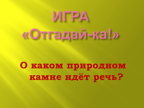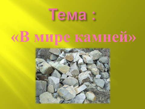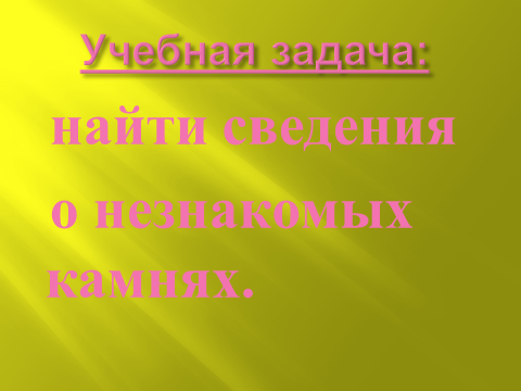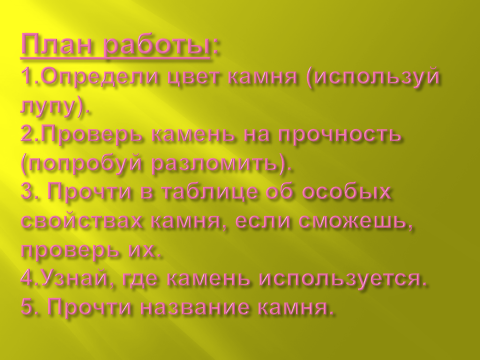 План работы:1.Определи цвет камня (используй лупу).2.Проверь камень на прочность (попробуй разломить).3. Прочти в таблице об особых свойствах камня, если сможешь, проверь их.4.Узнай, где камень используется.5. Прочти название камня.