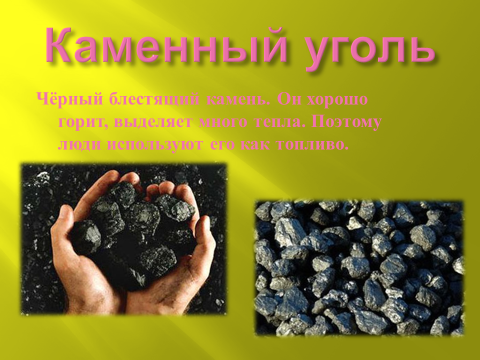 Чёрный блестящий камень. Он хорошо горит, выделяет много тепла. Поэтому люди используют его как топливо.