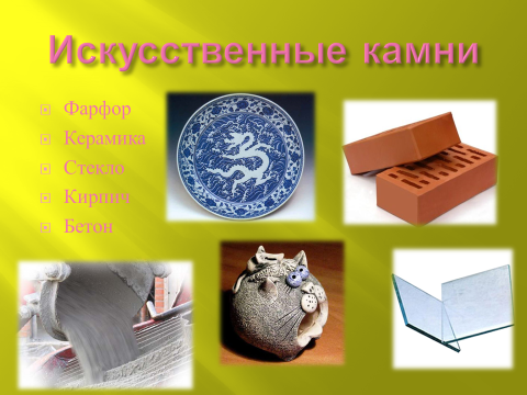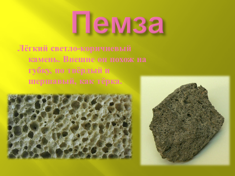 Пемза | Светло-коричневая. | Твёрдая и шершавая. | Пористая (похожа на губку), лёгкая, не тонет в воде. | Для шлифовки и полировки изделий, как гигиеническое средство. |