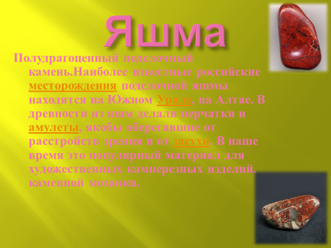 Яшма | Серовато-зелёная или красно-синяя и др.. | Твёрдая, прочная. | С причудливыми разводами и узорами. | Как поделочный камень: для изготовления шкатулок, ваз, табакерок. |