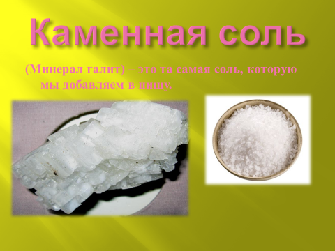 Каменная соль | Белая, серая. | Твёрдая, но колется. | Растворяется в воде. | Для приготовления пищи. |