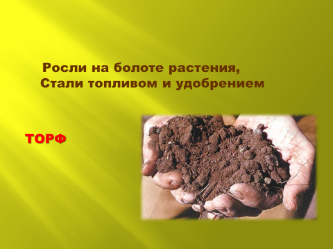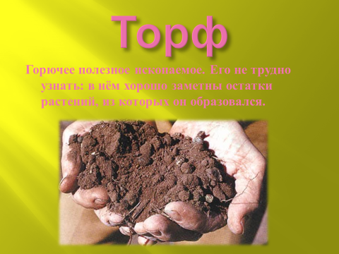 Торф | Тёмно-коричневый с остатками растений. | Твёрдый, но легко крошится. | Хорошо горит. | Как топливо и удобрение. |