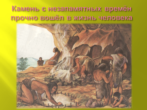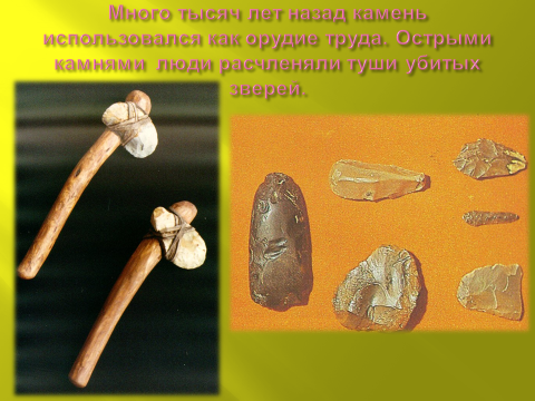 Много тысяч лет назад камень использовался как орудие труда. Острыми камнями люди расчленяли туши убитых зверей.