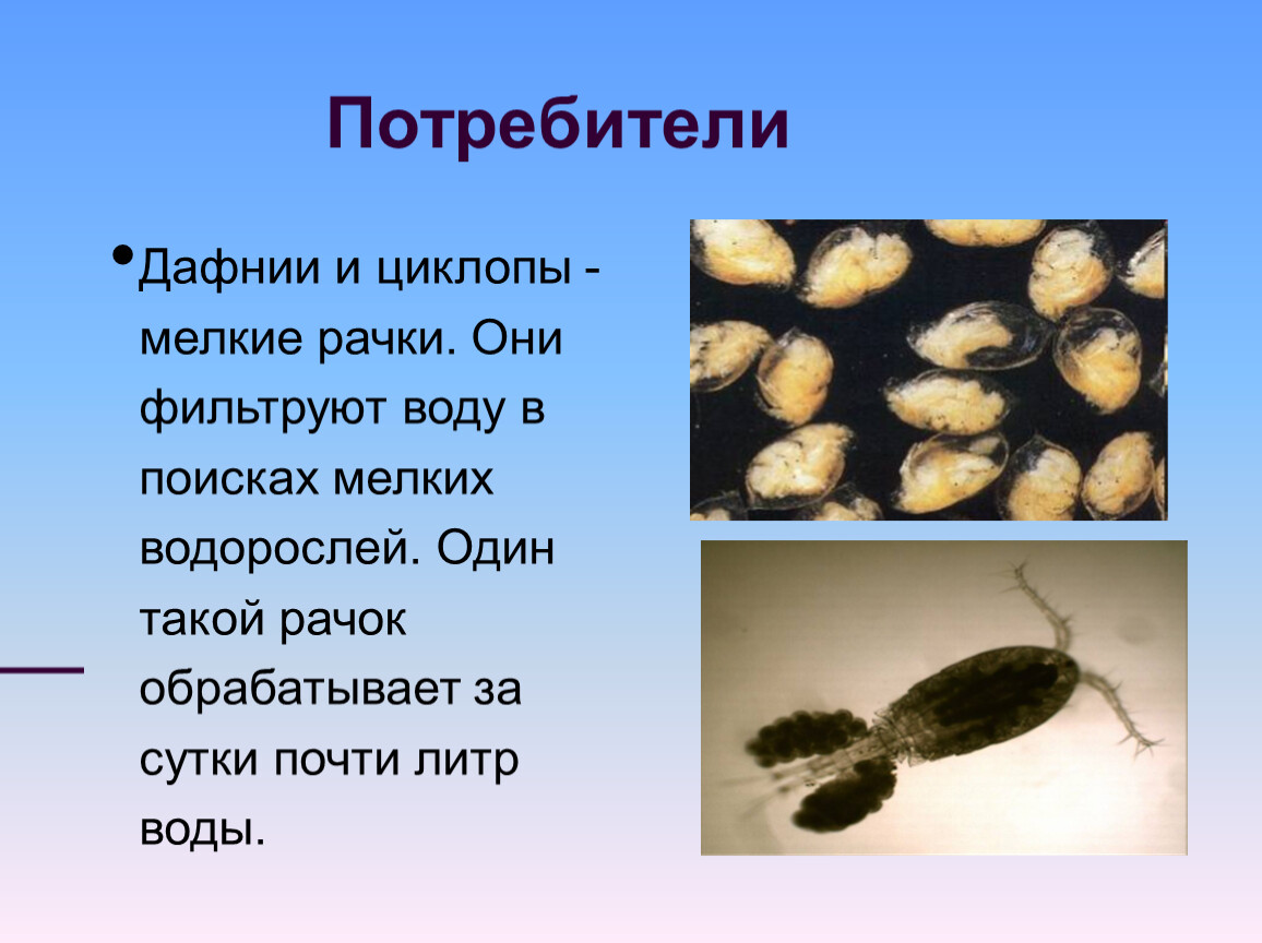 Дафнии и циклопы - мелкие рачки. Они фильтруют воду в поисках мелких водорослей. Один такой рачок обрабатывает за сутки почти литр воды.