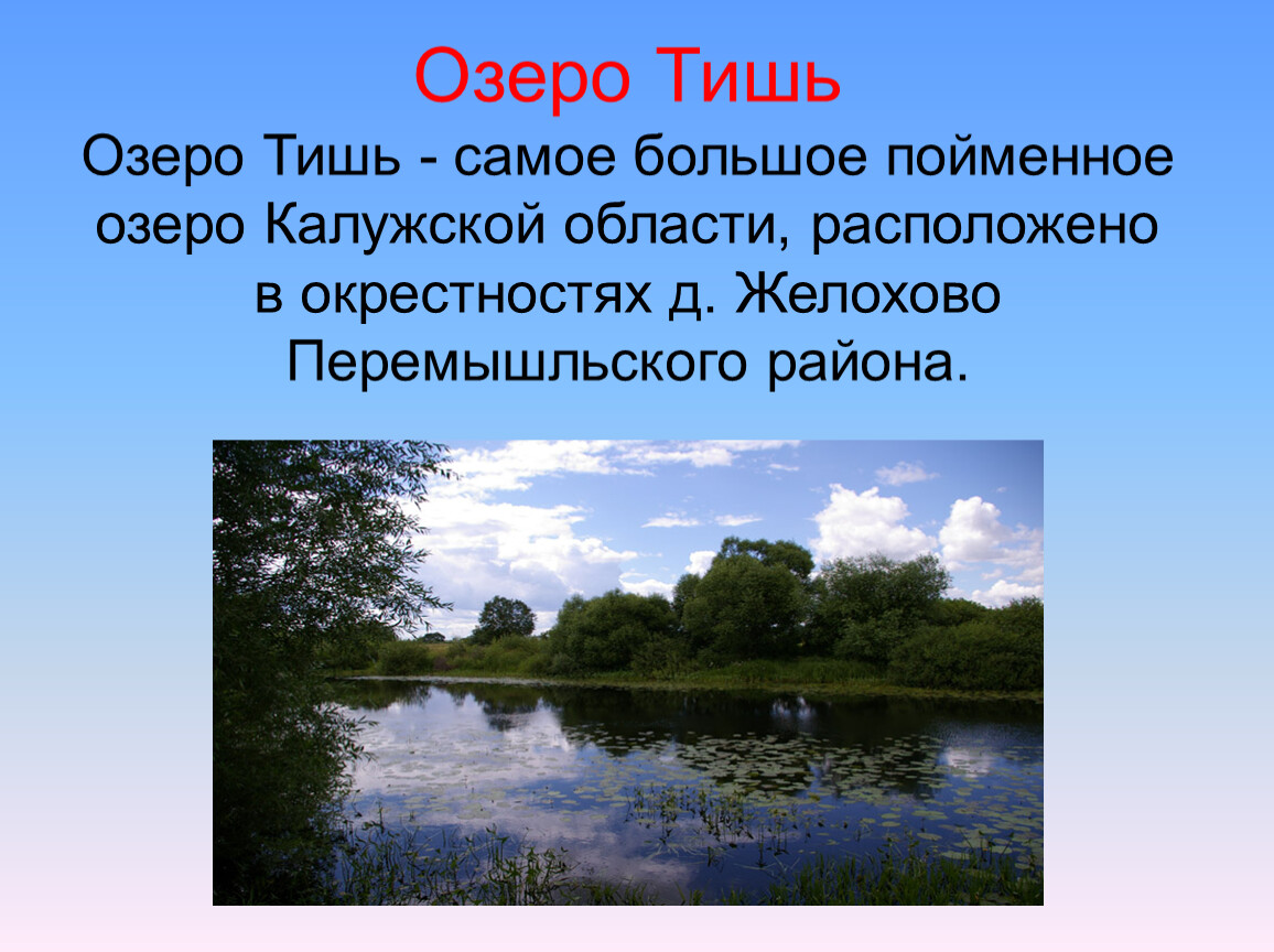 Озеро ТишьОзеро Тишь - самое большое пойменное озеро Калужской области, расположено в окрестностях д. Желохово Перемышльского района.
