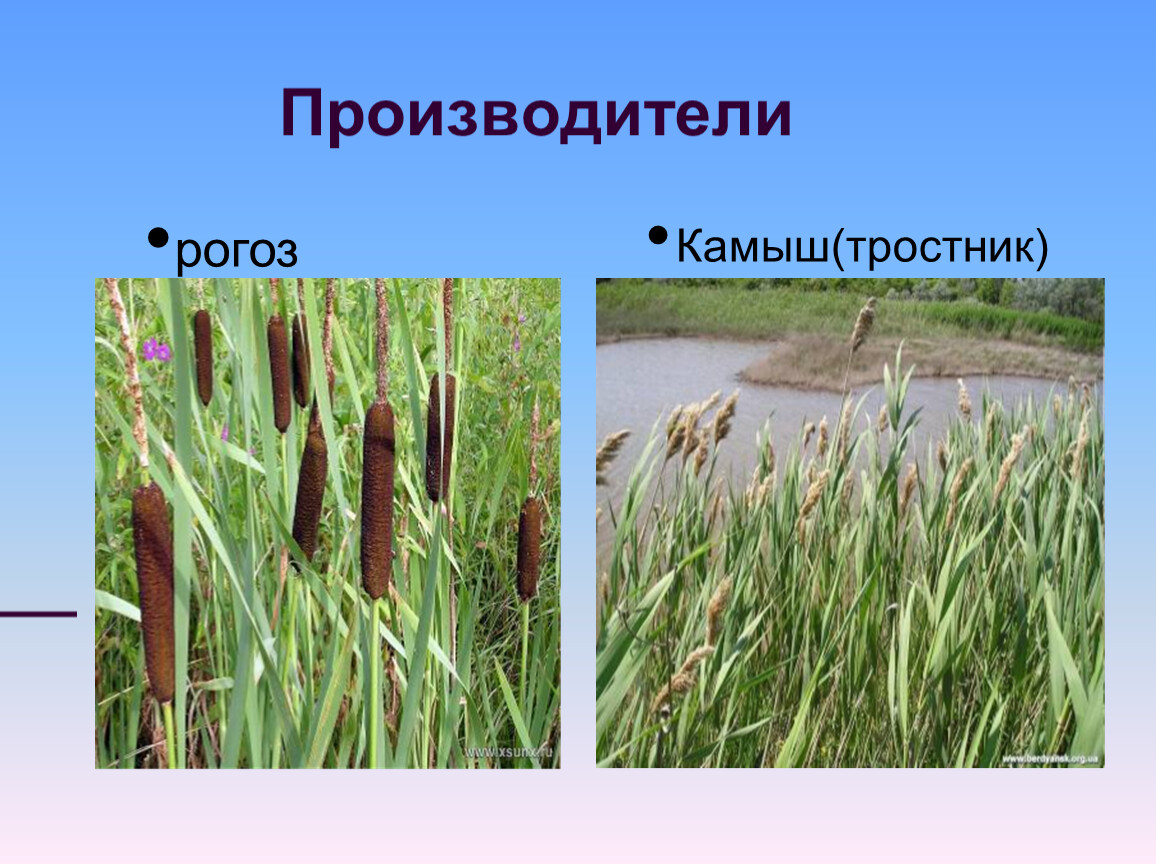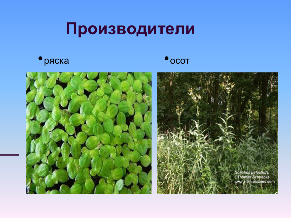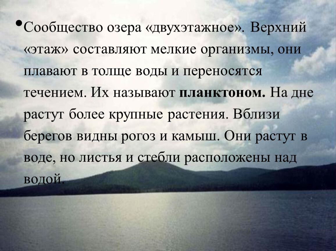 Сообщество озера «двухэтажное». Верхний «этаж» составляют мелкие организмы, они плавают в толще воды и переносятся течением. Их называют планктоном. На дне растут более крупные растения. Вблизи берегов видны рогоз и камыш. Они растут в воде, но листья и стебли расположены над водой.