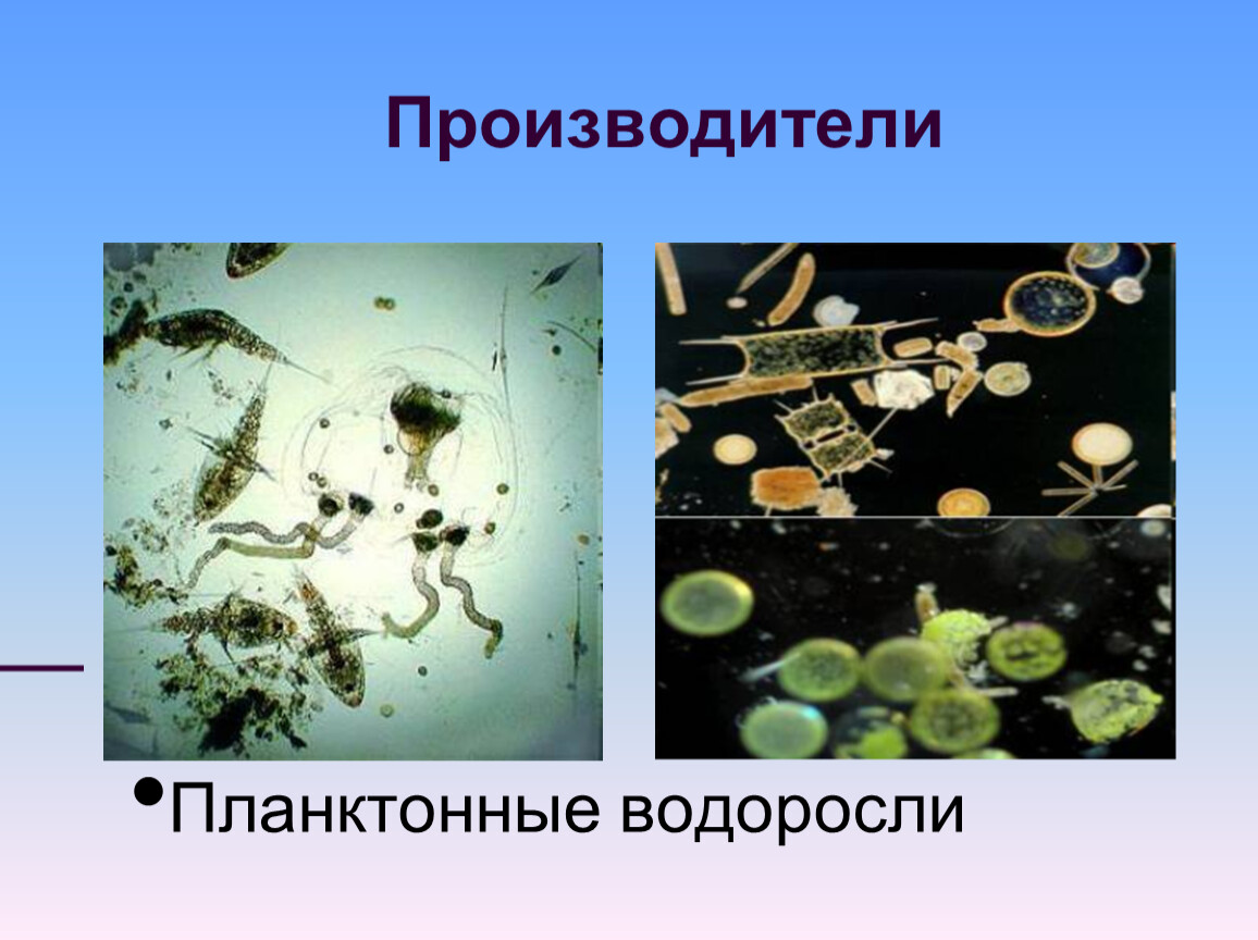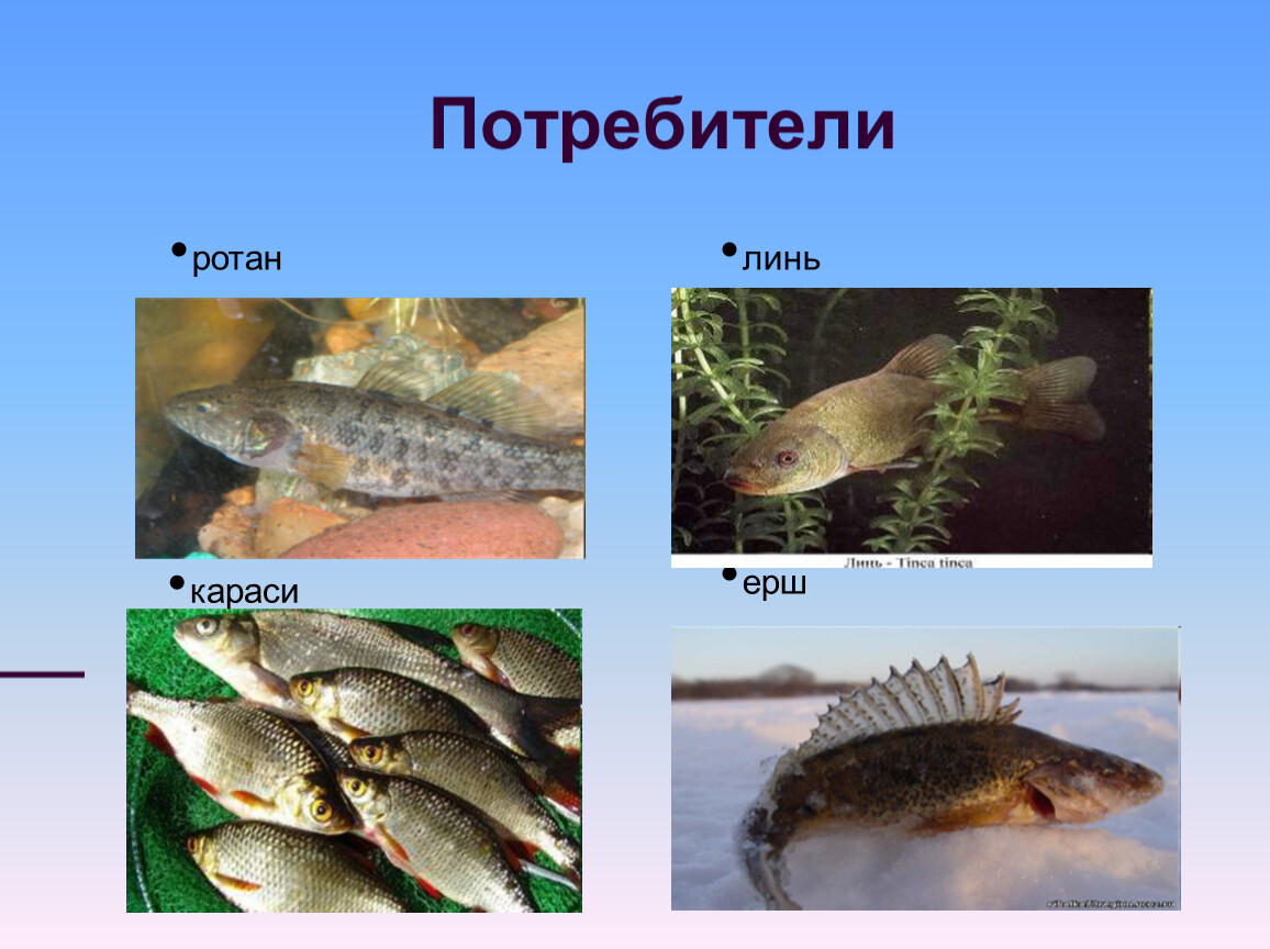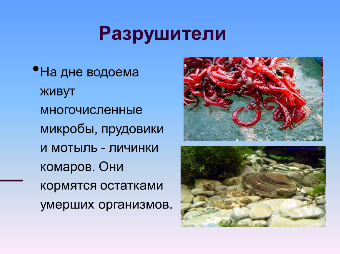 На дне водоема живут многочисленные микробы, прудовики и мотыль - личинки комаров. Они кормятся остатками умерших организмов.