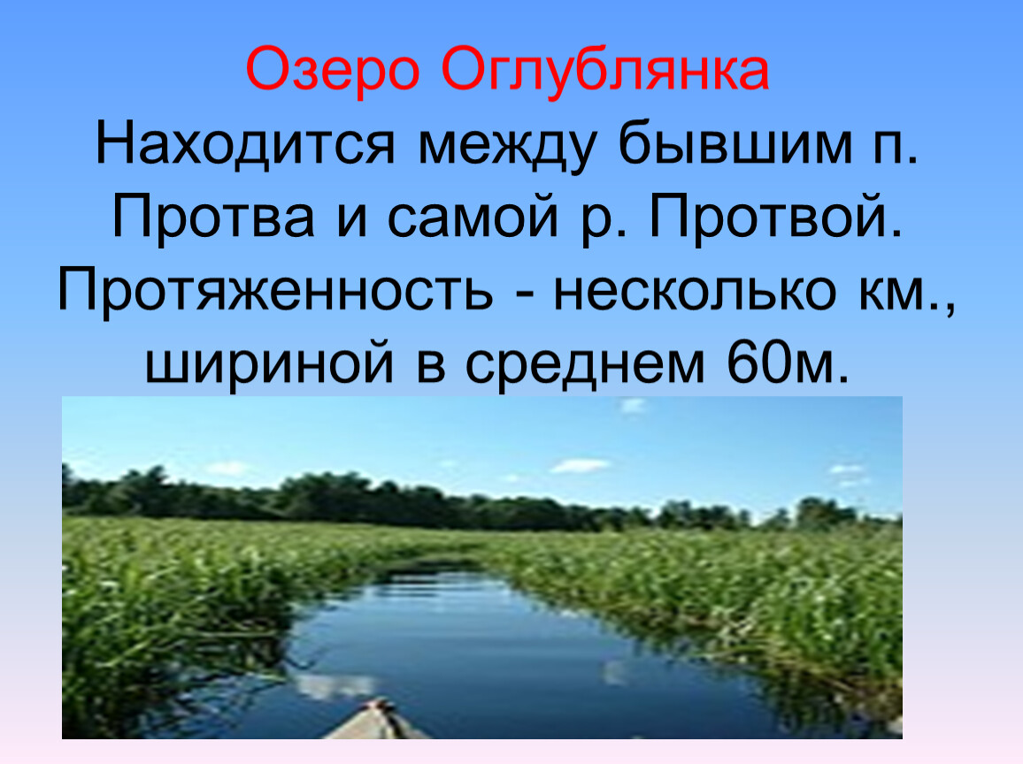 Озеро ОглублянкаНаходится между бывшим п. Протва и самой р. Протвой. Протяженность - несколько км., шириной в среднем 60м.