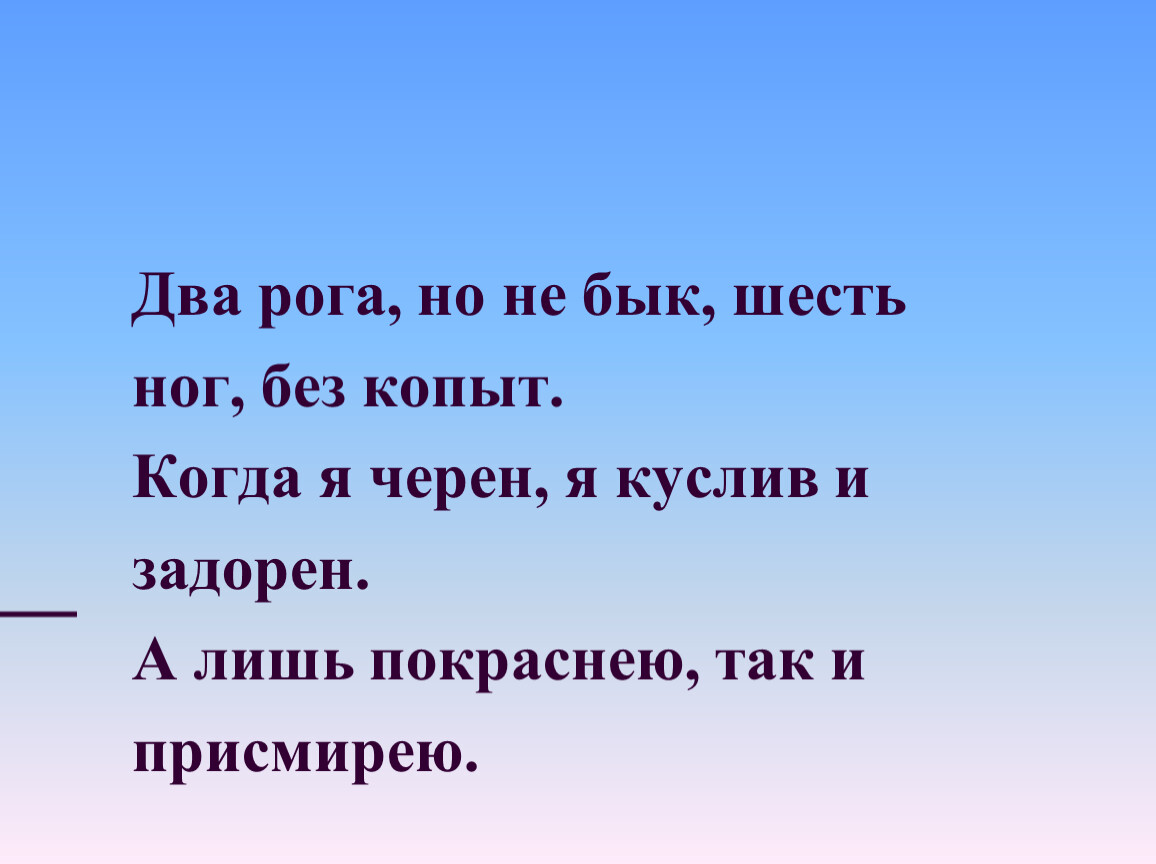 Два рога, но не бык, шесть ног, без копыт. Когда я черен, я куслив и задорен. А лишь покраснею, так и присмирею.