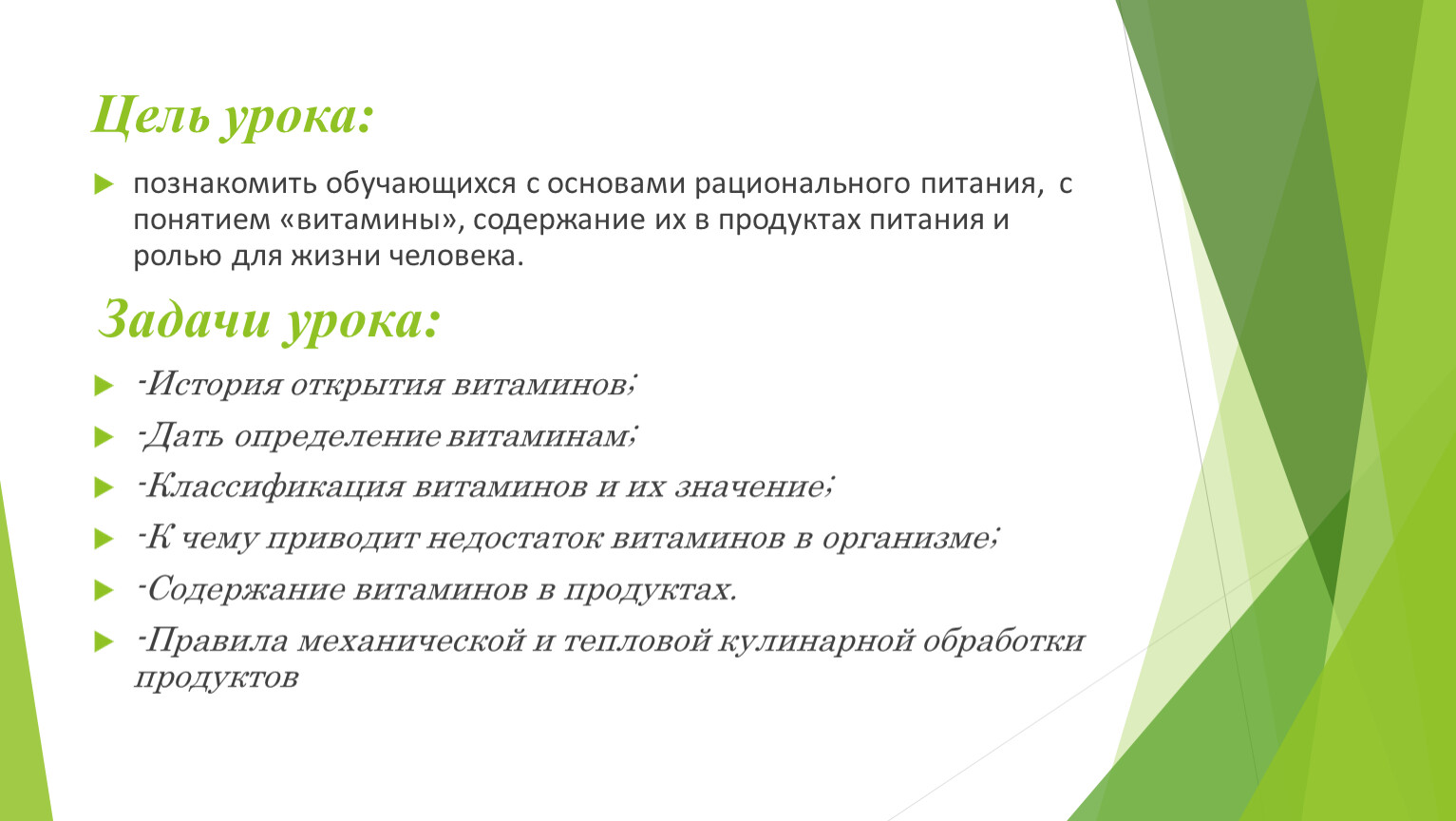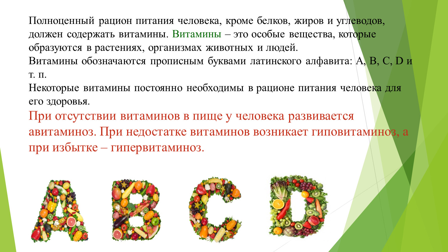Полноценный рацион питания человека, кроме белков, жиров и углеводов, должен содержать витамины. Витамины – это особые вещества, которые образуются в растениях, организмах животных и людей. Витамины обозначаются прописным буквами латинского алфавита: А, В, С, D и т. п.Некоторые витамины постоянно необходимы в рационе питания человека для его здоровья.При отсутствии витаминов в пище у человека развивается авитаминоз. При недостатке витаминов возникает гиповитаминоз, а при избытке – гипервитаминоз.