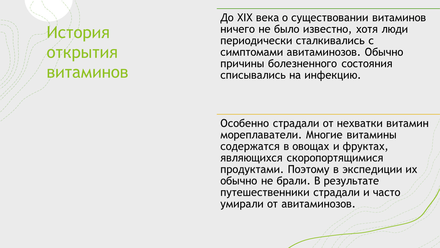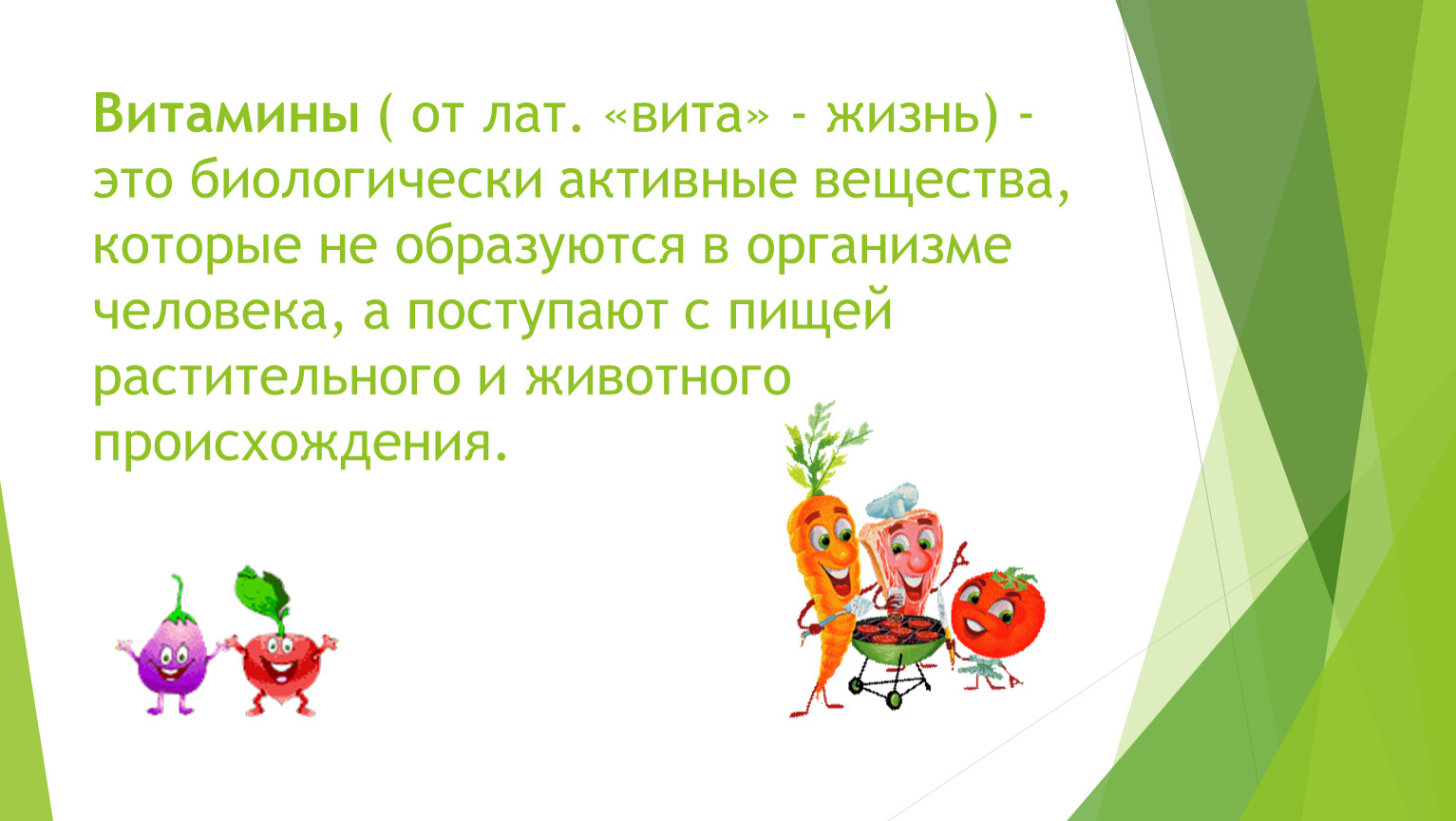 Витамины ( от лат. «вита» - жизнь) - это биологически активные вещества, которые не образуются в организме человека, а поступают с пищей растительного и животного происхождения.